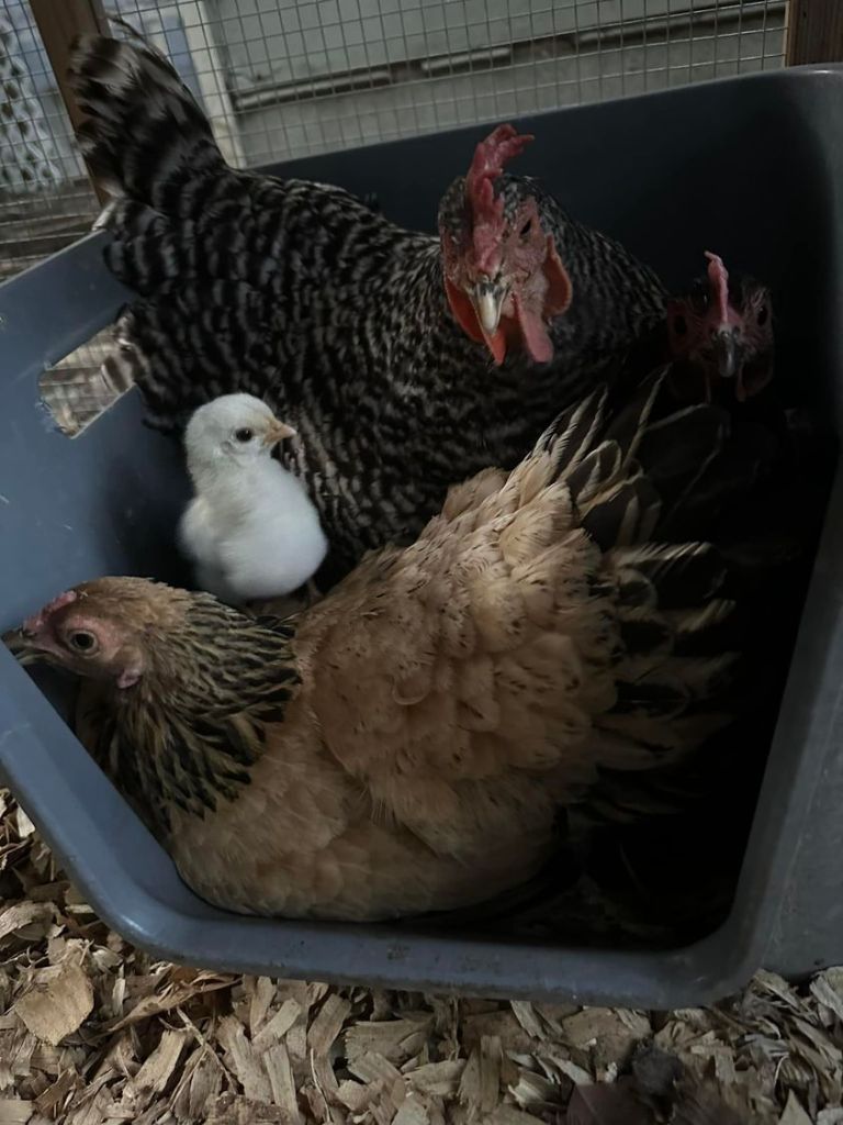 These three hens all co-parent this chick because they gave up on their eggs and decided to act like this one was theirs. I gave up on putting them back on their eggs because they just climb right back in here and spend all day following this one around and taking turns showing it stuff. It’s cracking me up.