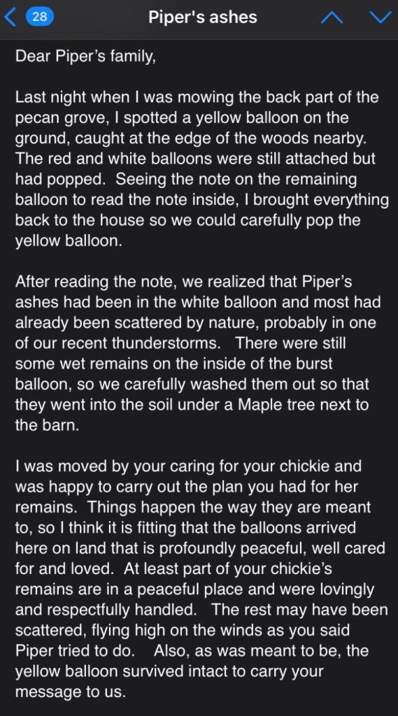 I wanted to share this story because I received a very sweet email from the woman who found the balloons and read our little letter. I wanted to show how some people are still very kind and that Piper’s life ended on a good note. Thank you, Laura, for all you did for our little Chickie.