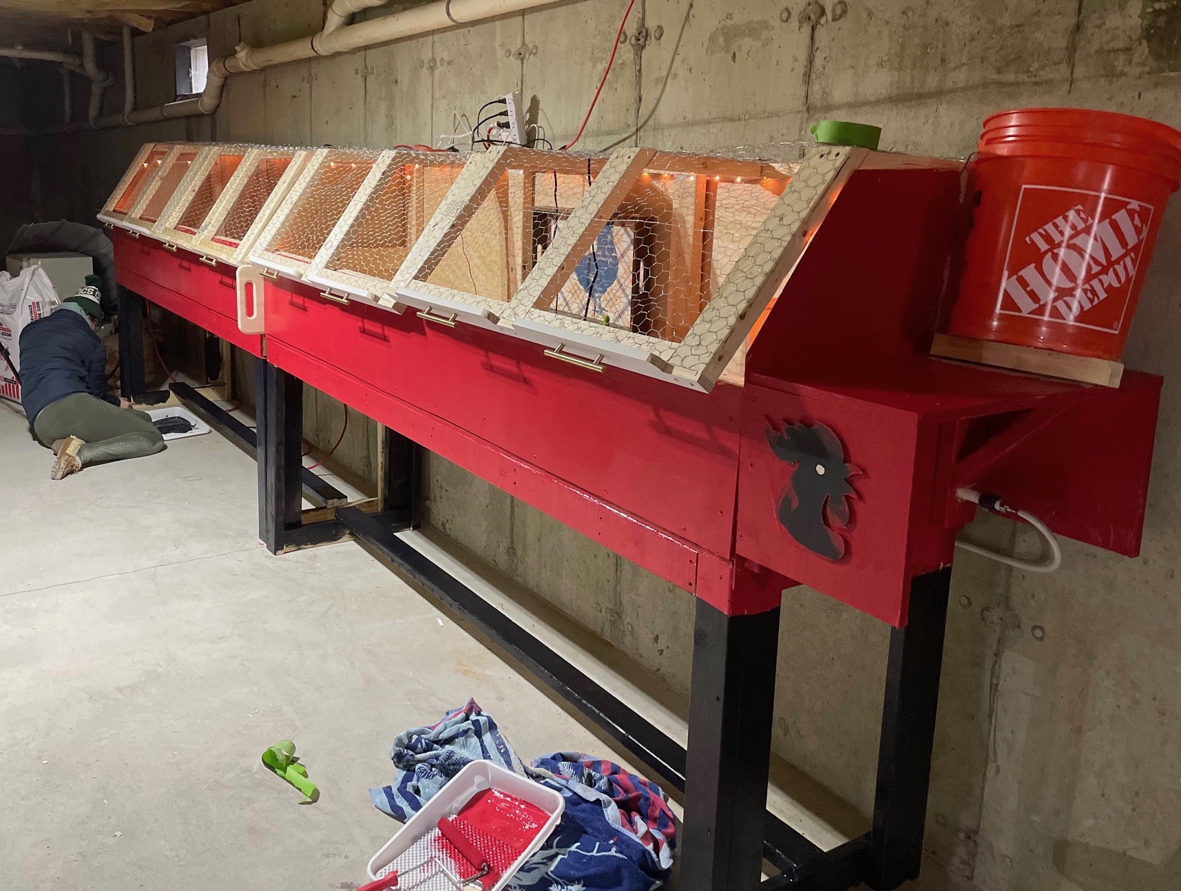 - Two large refillable feeding boxes with a spray painted rooster on the side