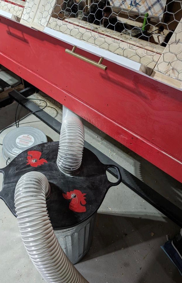 We did a lot of research, looked at brooders other people built and tried to come up with a system that worked best for us. So far, what we have found to be the best part about these brooder boxes is the dust collection system. To clean out these boxes is a breeze. We simply open the “gate” in the middle of the two boxes to herd all of the chicks into the empty/unused brooder box. Once they are all in, we close the gate. Then we have somewhat of a “trap door” that lifts up in the middle of the brooder box floor. Lifting this will reveal a 4” hose connected to a dust collection system/vacuum. Once it’s turned on we take a handheld broom and brush all of the dirty pine shavings down the hole.