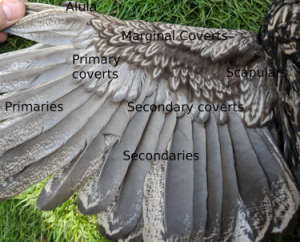 If you don’t want to see unsightly cut feather ends sticking out then cut just above the dotted line shown in the first image and no more than ¼” underneath the overlaying covert feathers so that just the tips of the coverts hide the cut ends of the primary feathers.