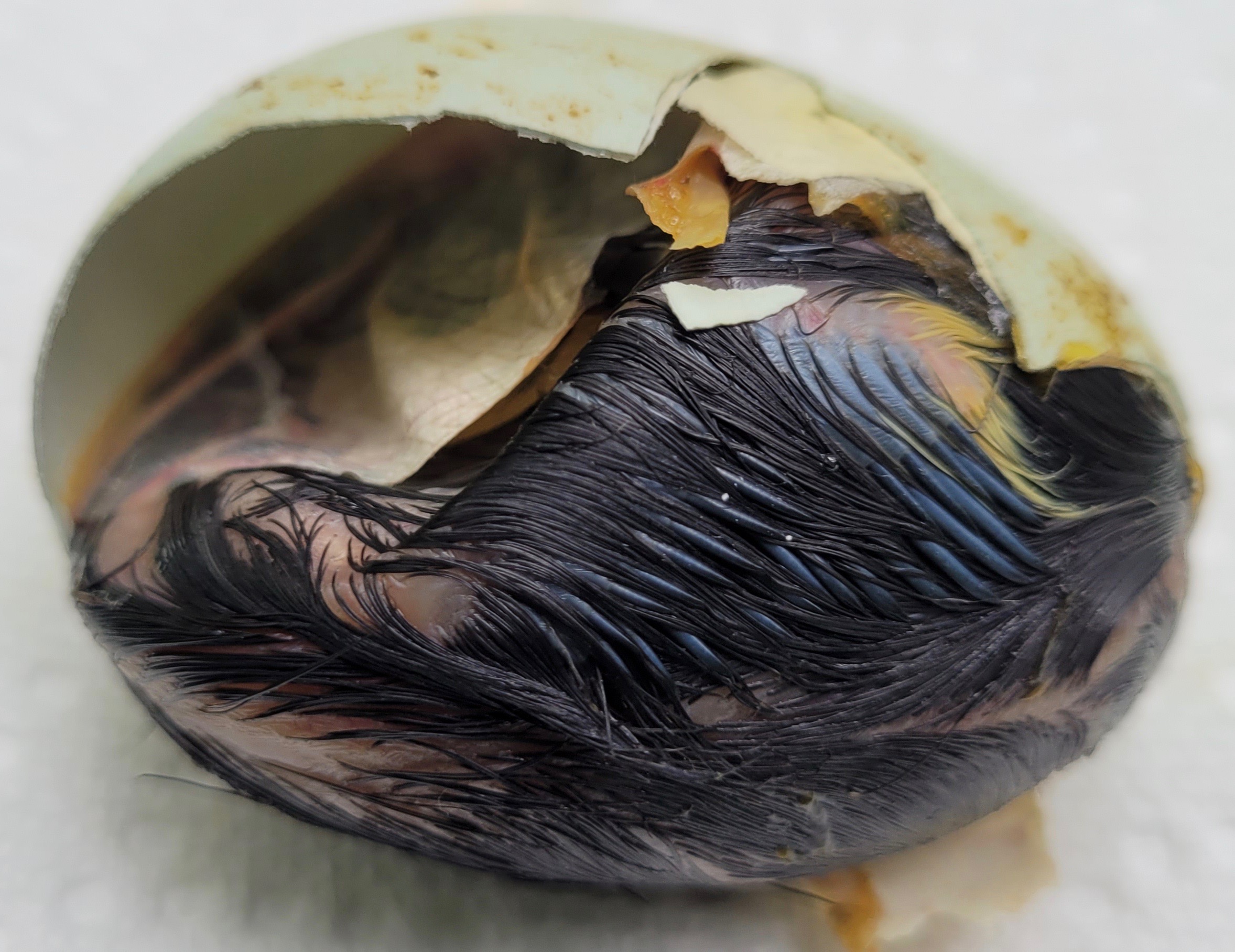 One Spot was a trooper and did not disappoint. The fertility rate, however, despite my rooster’s seemingly constant mating behaviour wasn’t stellar. Of the 11 eggs, only four hatched. I cracked open the remaining eggs: five were unfertilized, one contained a very undeveloped embryo that died early in development and finally, a chick that died right before hatch. This was a new one for me, in that, the large air cell was on the side and not at the wide end of the egg, so the chick developed around it. As you can see from the first photo the chick was indented. Third photo shows fully developed chick as well as an early ‘quitter’.