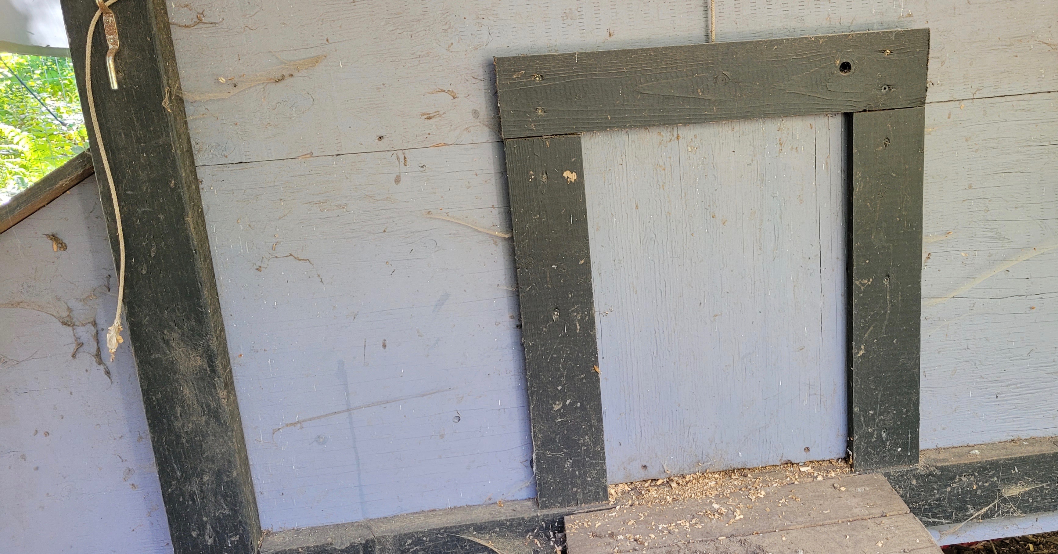 Several years ago my partner and I converted our greenhouse into a workshop. The original building was sided over with plywood ranchwall before 12 windows were installed. I kept those dozen wooden cutouts thinking they might come in handy some day. It turns out they were the perfect size to place over the old coop door openings in order to customize them for my new Run-Chicken door.
