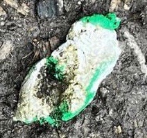 Bitchin’ Chickens: Don’t be fooled; this is a normal green poop from my flock. If you notice the formation is as expected, complete with the ‘frosting’ urates on top. The pigment is the result of what they ate: cabbage. It just goes to show that not everything that looks a little weird is cause for alarm. (FYI: it’s actually quite bright green in person)