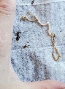 What am I dealing with here? I saw this stuck to my hen’s butt. Is this a worm? If so, what kind and how do I treat it? – Sabrina Perner