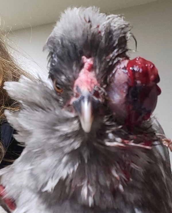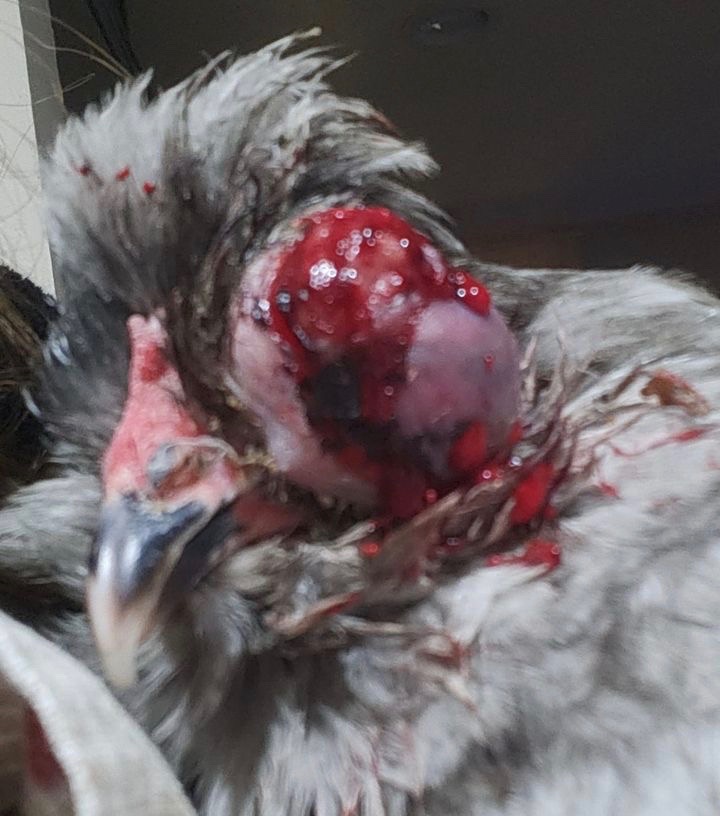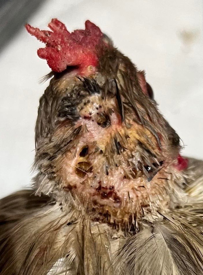 This is a rescue hen that was the victim of a pecking injury in which her skin over her skull was degloved. The vet sutured her up. I have her in my garage and have been applying Neo-Predef as needed because she’s scratching at it. I’ve tried Terramycin and Veterycin spray. We removed the sutures yesterday and all these holes are forming. I’m assuming the tissue is necrotic. – Kait Cerf