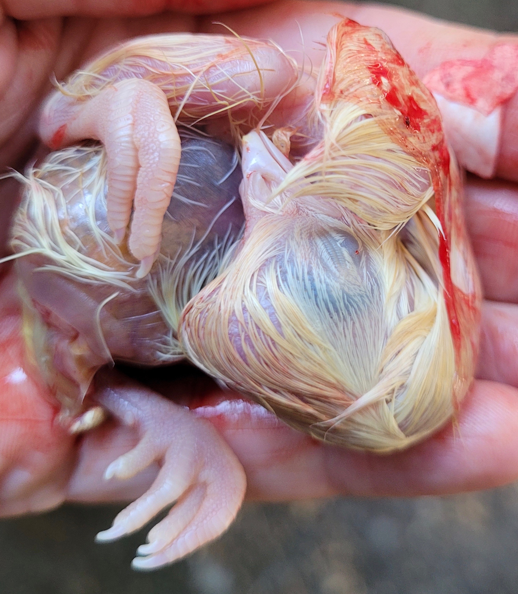 By the next morning it was still in the same position having been shrink-wrapped by the dried out white membrane trapping her from moving. It was before 7am and I only had a few minutes before catching my bus, and then ferry, to work. I went into assistance mode: quickly peeling the entire eggshell and membrane from around the chick. The veins had all receded so I felt it was safe and the only way to save her. I tucked her under Blue Ears and hoped for the best.