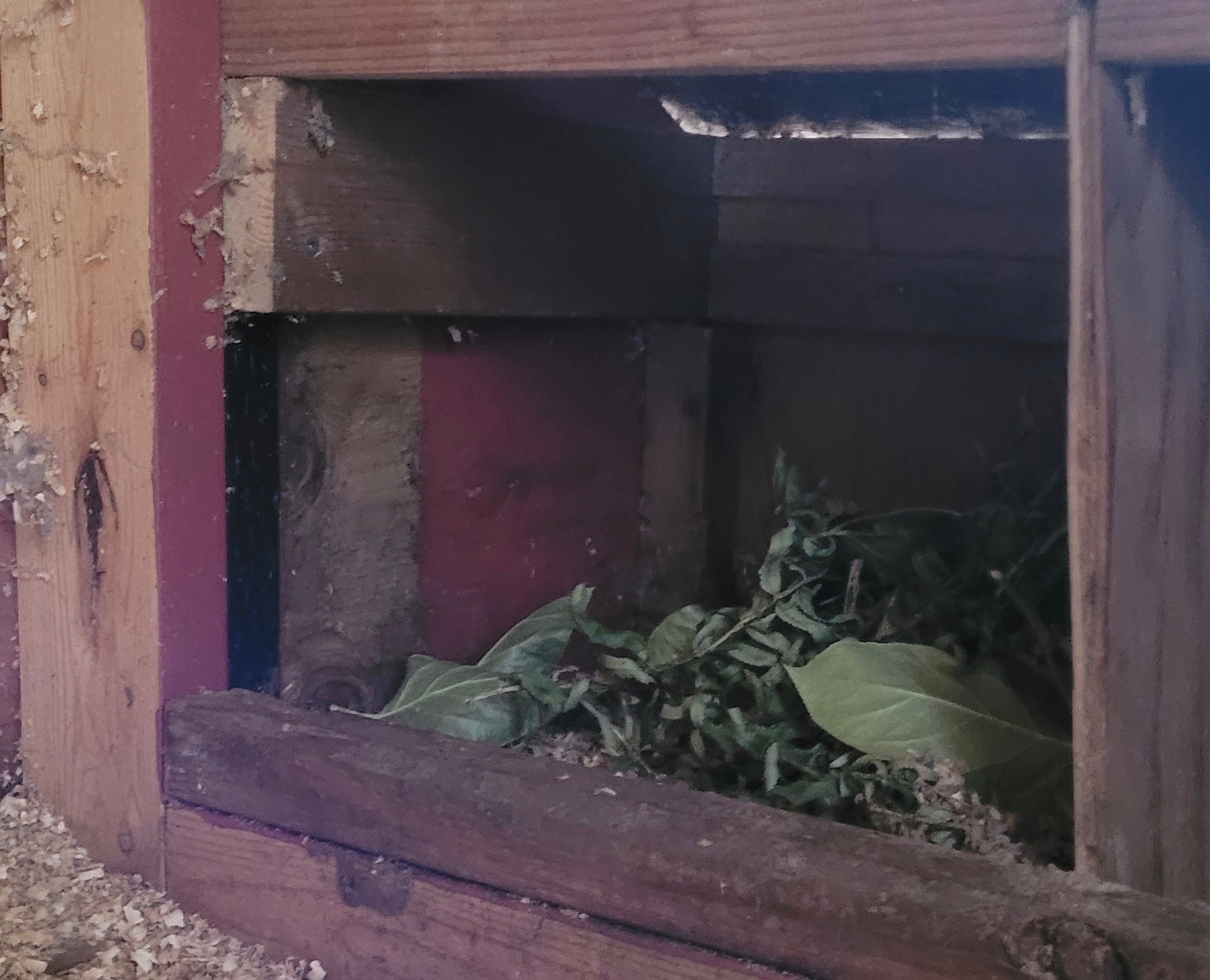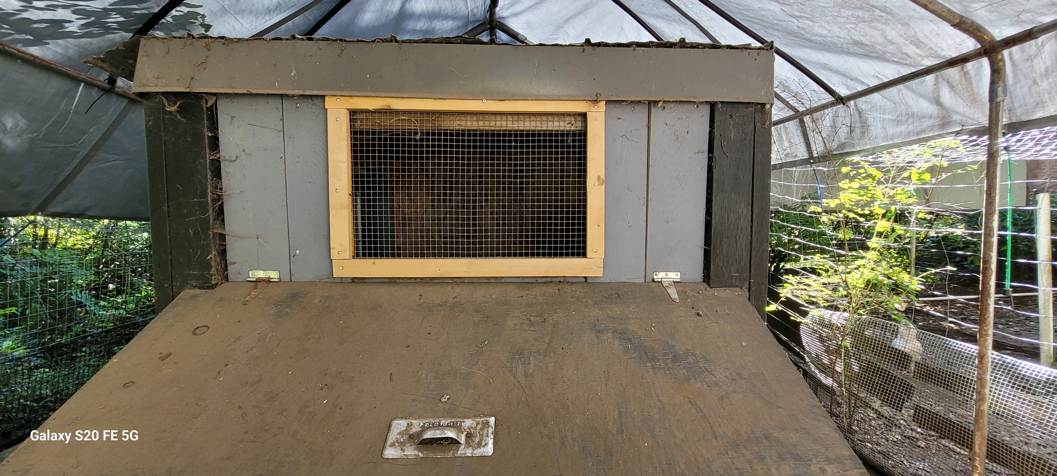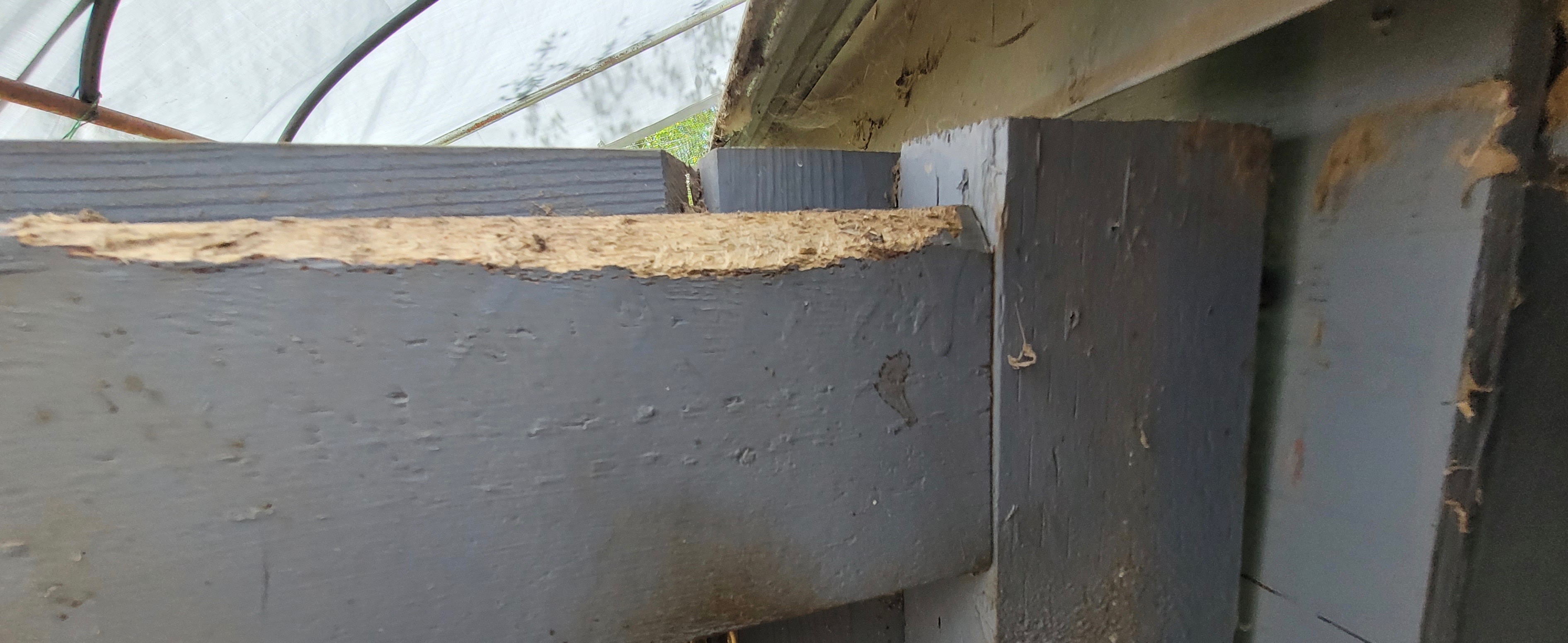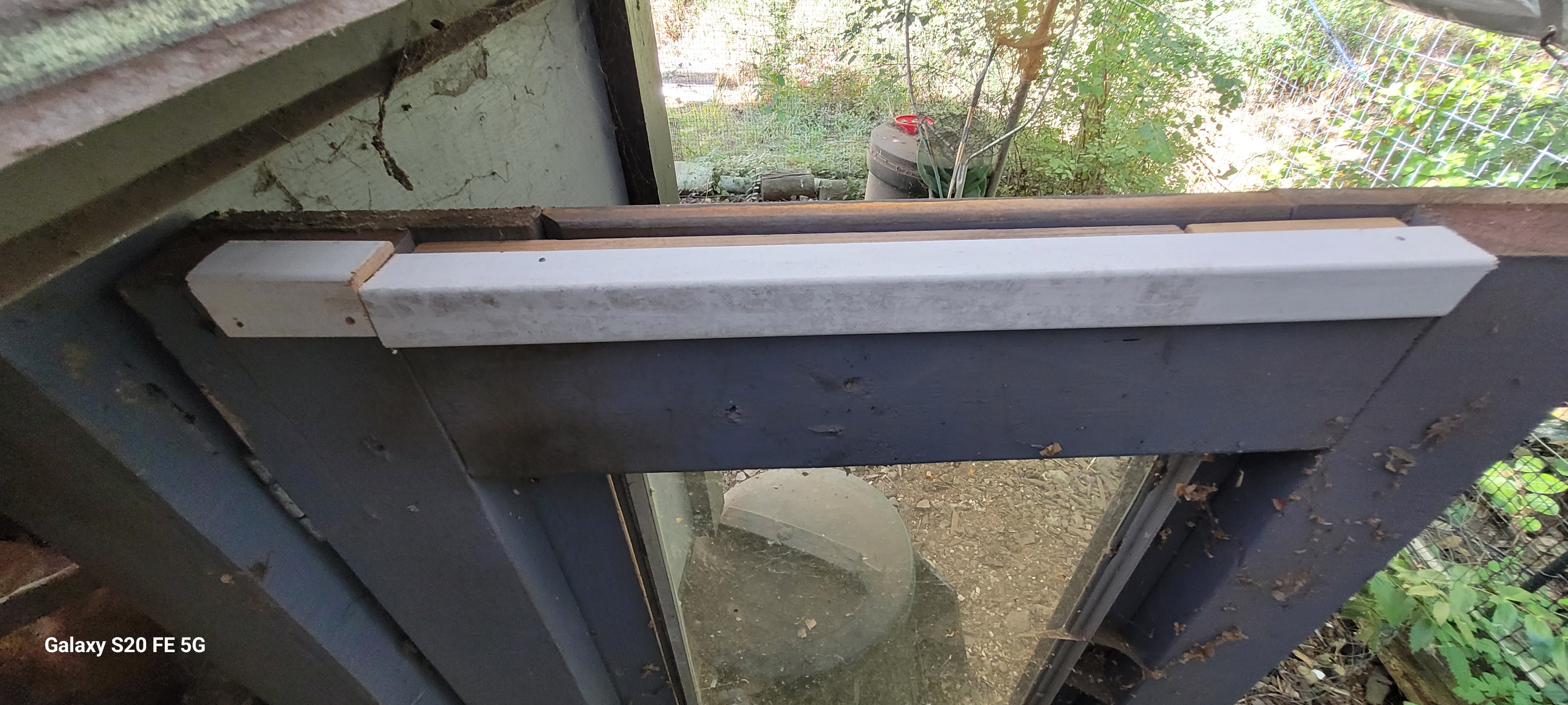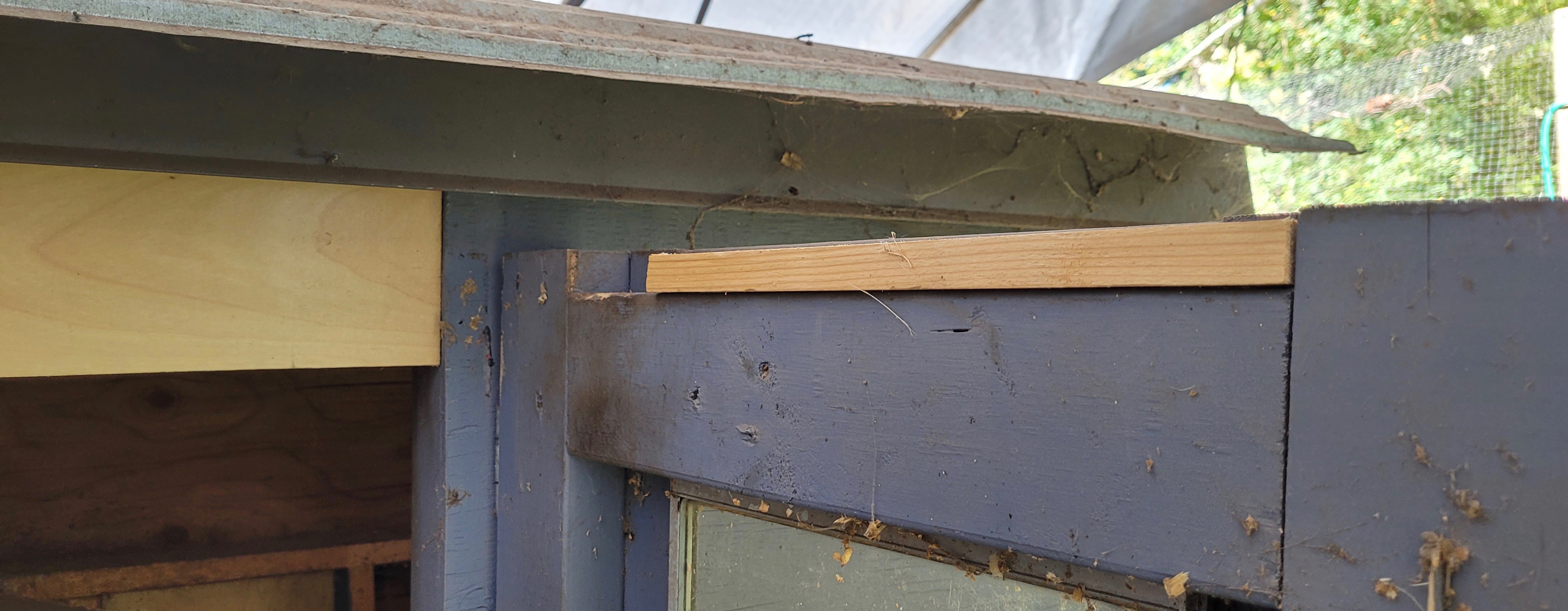 That evening Jan and I removed the vent where I thought the rats might be coming in and covered the opening with hardware cloth. Just as we were finishing she noticed a small gap at the top of the door frame. From the outside it looked like it fit tightly but there was enough space for a rat to scoot along and squeeze into the coop. We also saw that they had enlarged the hole with their teeth. It was the last thing we wanted to do, given we were experiencing a heatwave, but we figured out a way to block off the opening. The coop was now rodent proof and I check it nightly to see if have continued to foil them.