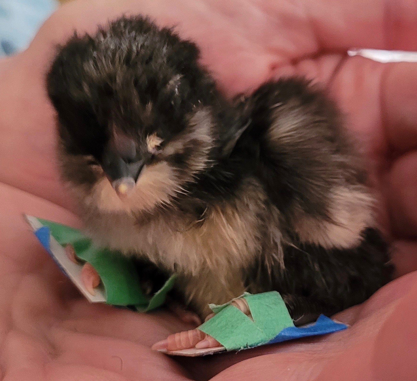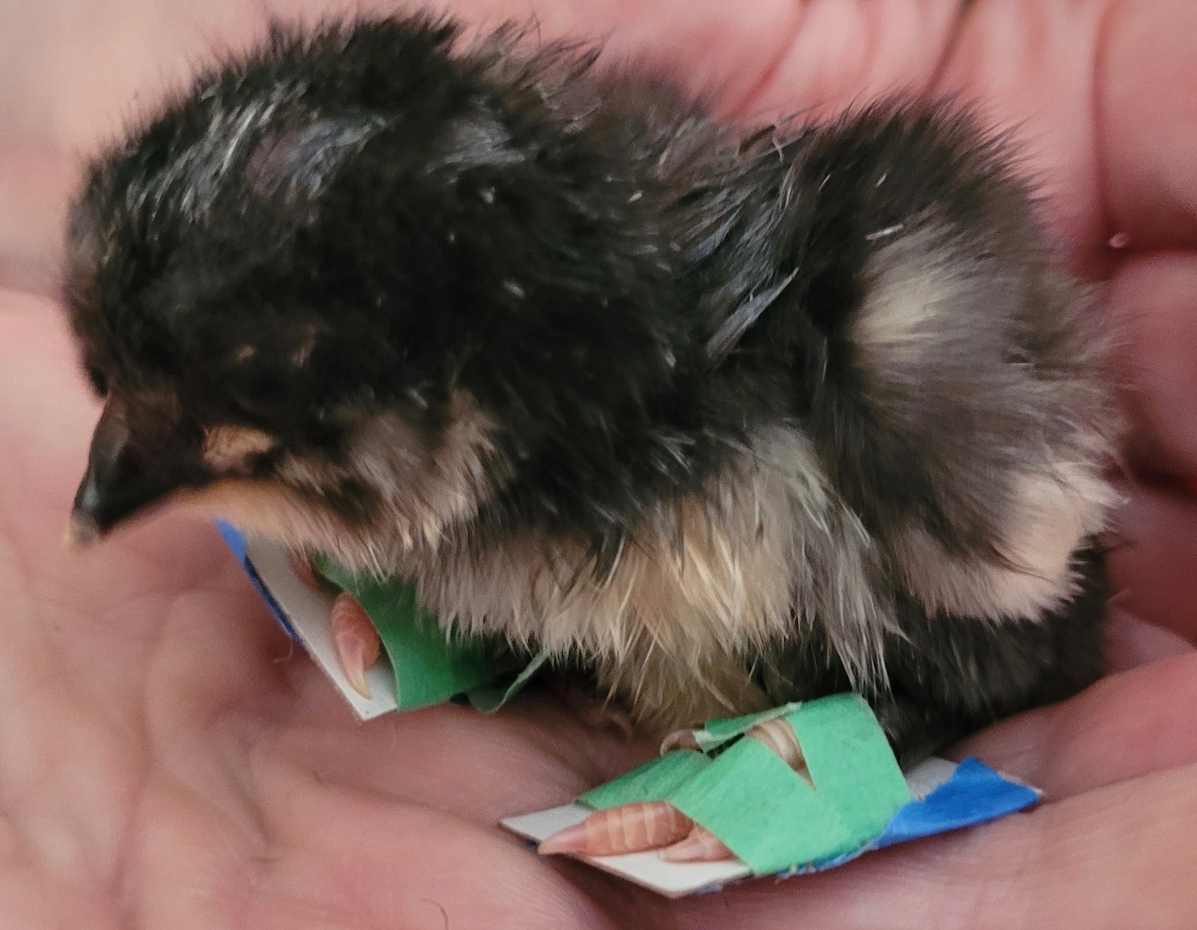 I have to give her credit; Jan jumped into action and set up a heating pad and an infirmary for the little one. When I came home the chick was alert and chirping up a storm. I lifted it up only to find it had curled toes, something I’d never had to deal with in my flock. The condition can be caused by genetics but mostly is attributed to incubation issues. If caught early it can be fixed; otherwise, that bird would have deformed feet for the rest of its life.