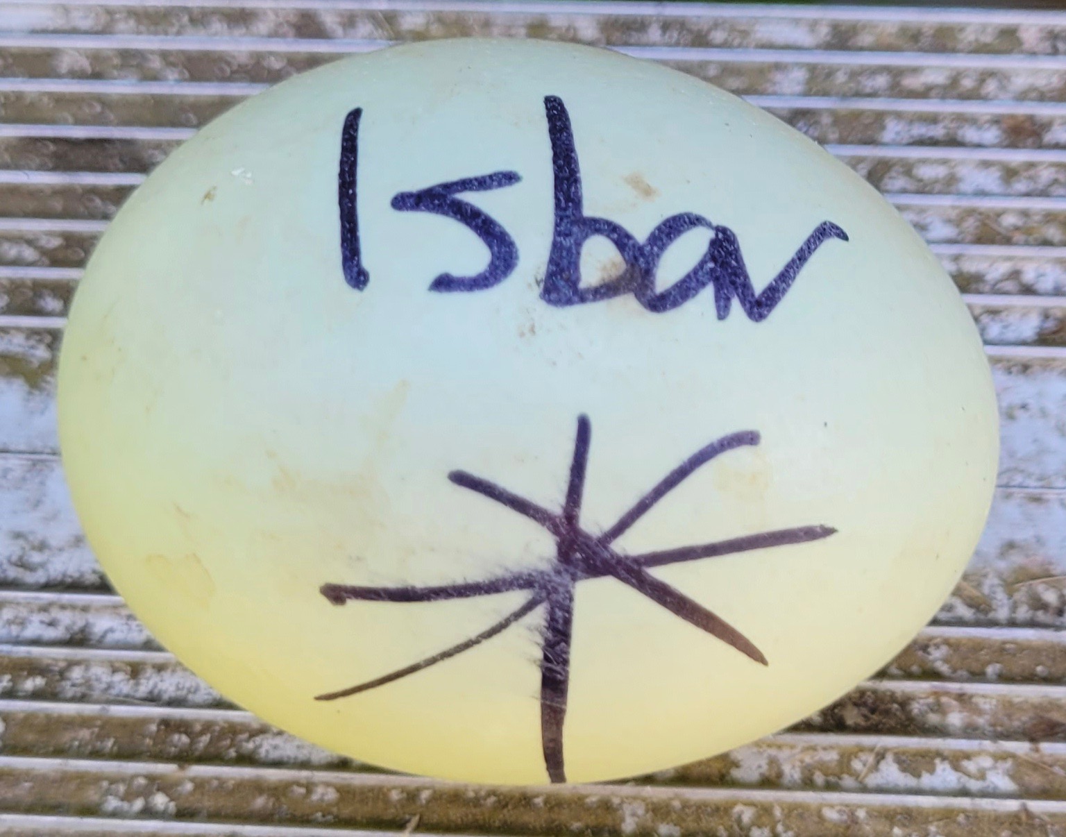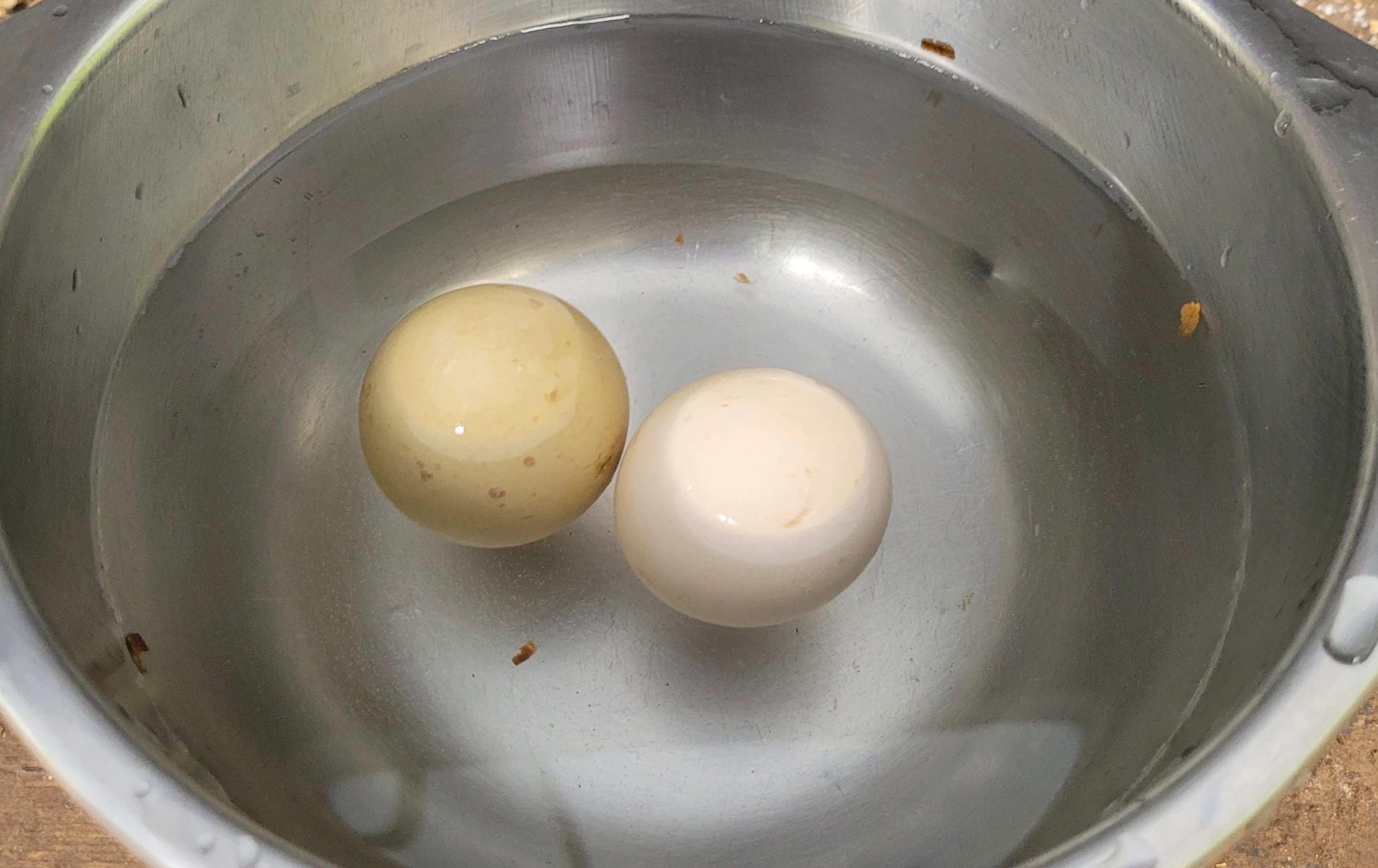Some folks candle eggs, while others swear by the float test to determine if eggs are viable or not. The idea is you put the unhatched (and unpipped) eggs gently in a deep bowl of 100F/37.7C water and see if they sink, float high, float low, or float on their side to figure out which ones might contain a living chick or not. I floated the eggs and, frustratingly, they all looked about the same. I also tried another method: tapping the egg with my fingernail to stimulate the chick. On my second tapping one peeped so I added that one to Buffy’s cache. I also put one olive egg that I hoped would hatch under her. Both viable chicks hatched overnight; sadly, the olive one was unfertilized.