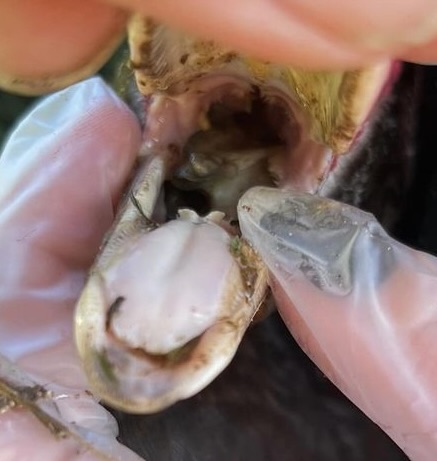 What is wrong with my muscovy? She developed a bump under her chin a couple of days ago and it’s gotten bigger. She’s not eating but can drink. This is what the inside of her mouth looks like. Is the boney looking thing a foreign object or a part of her? – Meadow Masers