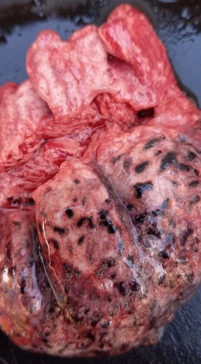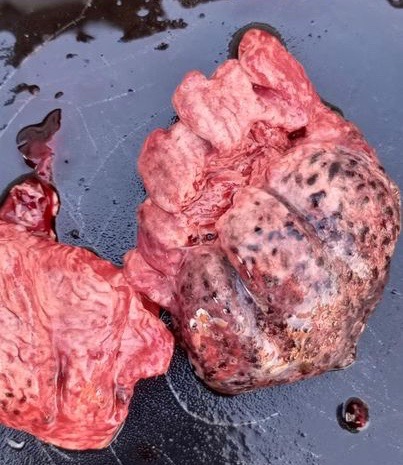 Dr Bowes: There are bulging focal areas of hemorrhage. The demarcation between normal and abnormal tissue is interesting. The lungs are overinflated with pulmonary hemorrhage and aspiration of blood. A cross-section photo of the lungs would help with a diagnosis. Is the hemorrhage interstitial (in the tissue) or in the airways? This appears to affect the airways. Fungal infections can block the airways and erode blood vessels causing bleeding. It’s interesting only one lung is affected.