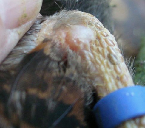 I need help with my 3½ year old quail. Zorro. He started limping, holding one leg off the ground. I found a bump on the outside of his hock. It looks like a blister, but it’s hard. His leg is fine, no swelling, bruising, cuts or bumblefoot. He’s eating and drinking. I would think it was an injury, except his daughter came down with exactly the same thing this summer. I left her untreated hoping it would heal. Eventually, she got worse and lost a lot of weight, so I euthanized her. I’ve put Tylan and Poultry Cell in his water, and gave him a drop of Metacam. I don’t really know what else to do. Any ideas what this is? – Fiesta Cranberry