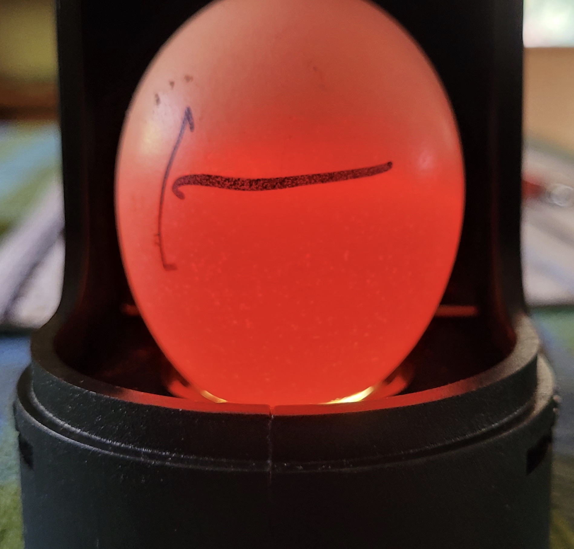 I’ve had dozens of hatches with broody hens. Many folks candle their eggs (whether using an incubator or a hen) at various points during incubation to ensure they are viable and pitch the ones that aren’t developing. For the most part, I’ve opted for the ‘wait and see’ approach. When I have tried to candle eggs using a flashlight it’s been with mixed results.