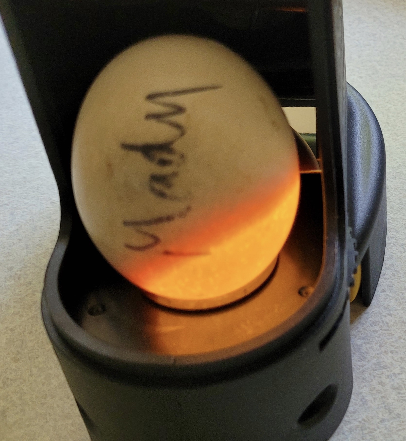 I won’t claim any skill with using it and would probably benefit with more practice. This is the deluxe model that consists of a darkened chamber that blocks ambient light, an internal mirror and an egg platform that can be rotated to see all sides of the egg. The batteries operate a high output LED light that can illuminate dark-shelled eggs. Although it is advertised that the scope can be used in daylight I found it was much easier to see into the egg after dark or in a semi-darkened room.