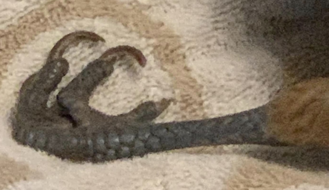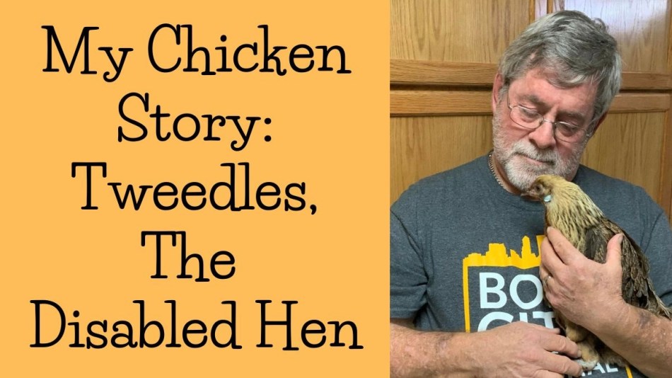 Tweedles (my wife named her) was offered to me as “a chicken with a hurt leg”. At first, I refused but when I realized what her future would be, I adopted her.  She didn’t have a hurt leg; she had two damaged legs: one faced forward and the other backwards. And she had two badly deformed feet. Tweedles was totally helpless and could not stand nor walk.