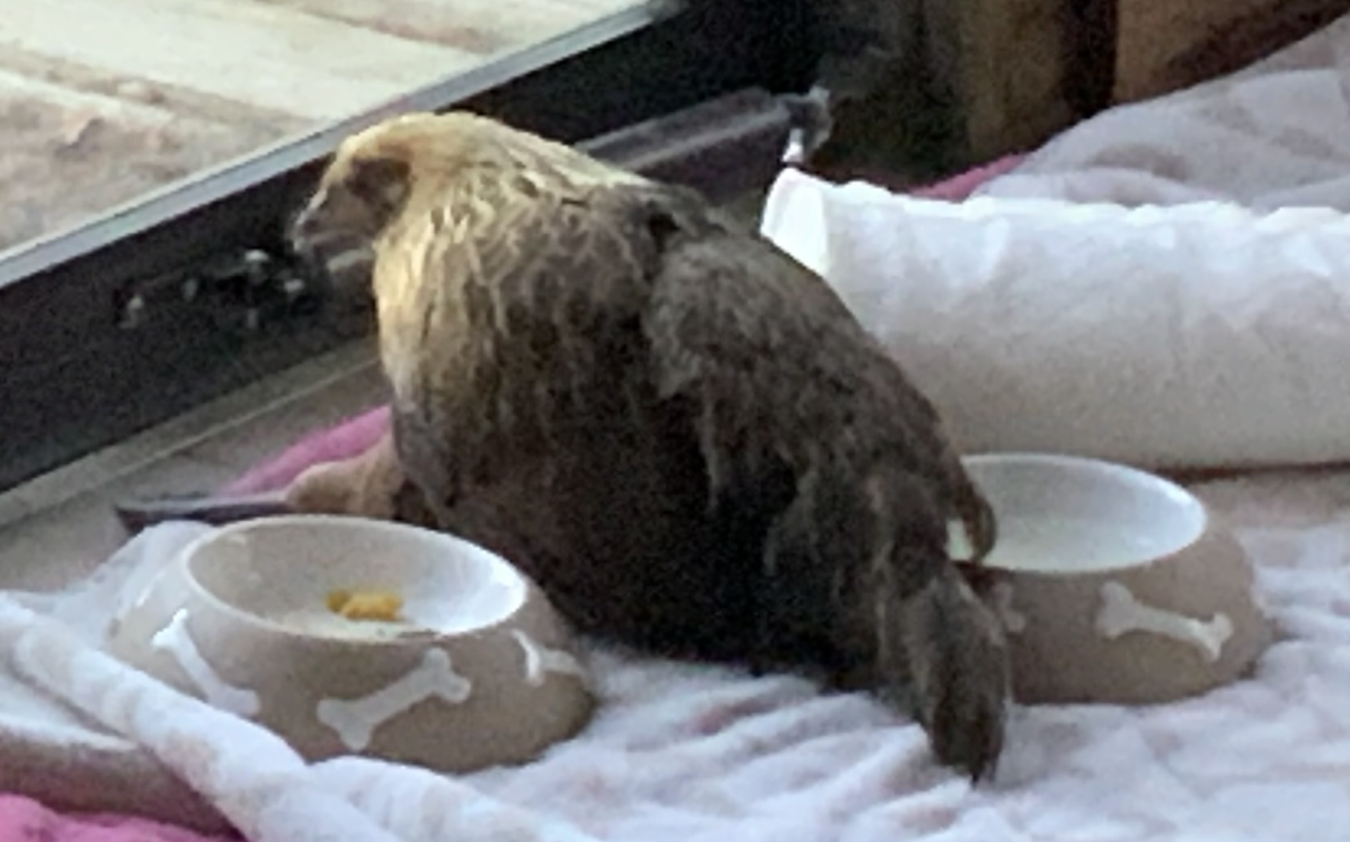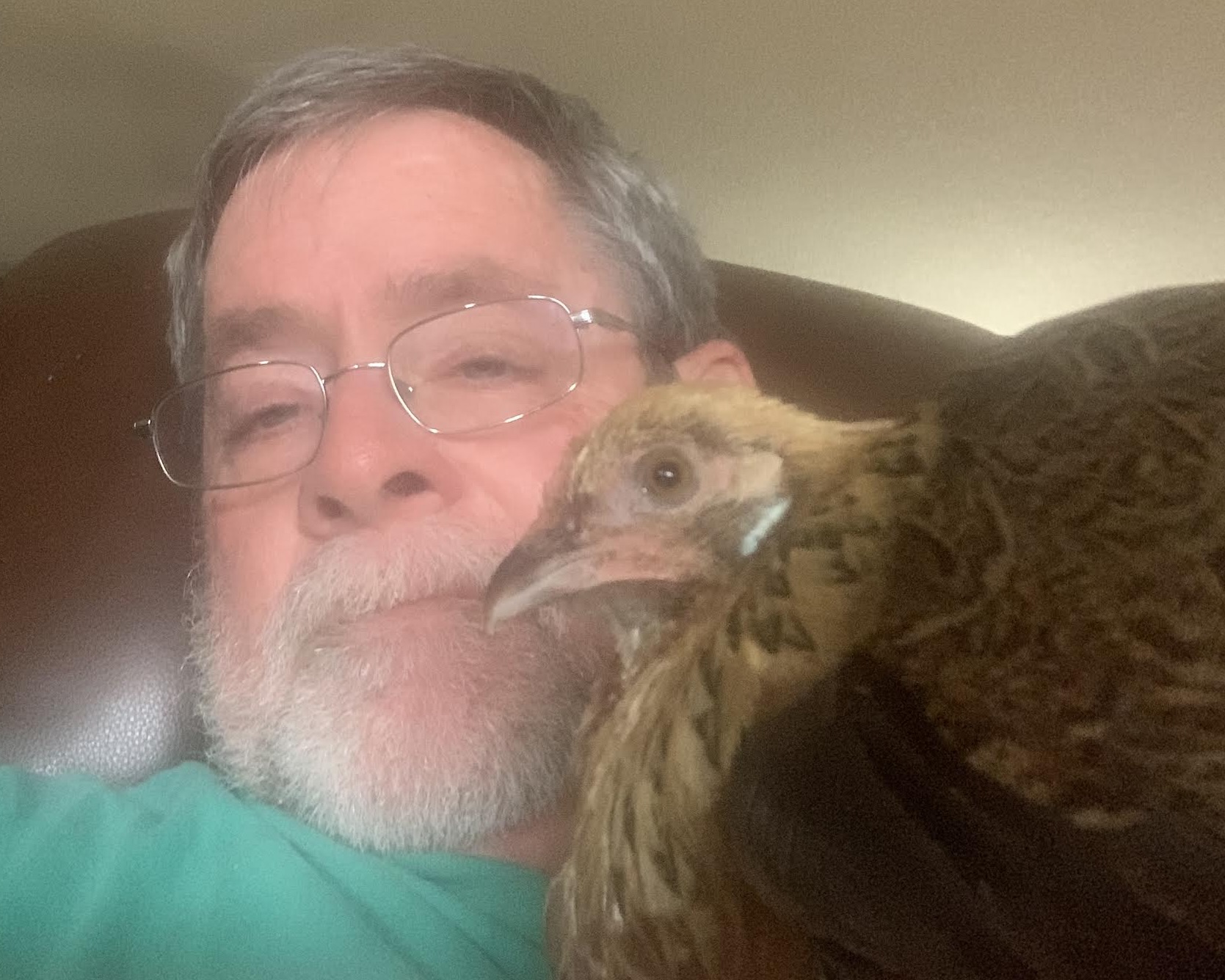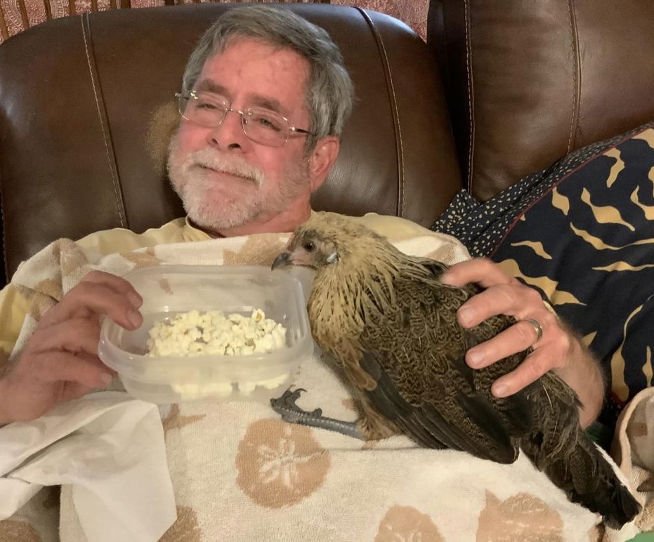 She was the sweetest chicken, staying in a cage during the day and at night I would place a towel across my chest and Tweedles would lay there and watch TV with us. Her favorite movie was Chicken Run. She even got her own bowl of popcorn. I would stroke her head and she would fall asleep. I’m 72 so I would also fall asleep. It’s every old man’s fantasy to have a young chick to sleep with… Sorry about that, but I can’t resist saying it. My wife is rolling her eyes over it.