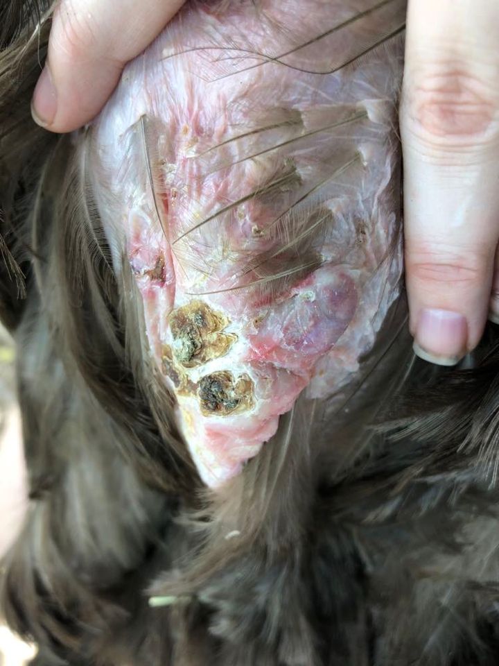 Dr Bowes: A few observations: your dosage of Ivermectin was far too high. Two-three drops applied topically is fine. Baytril should never be used to treat Staph infections. Amoxicillin or penicillin would be appropriate. The area is inflamed and needs diagnostics to determine what species of bacteria you’re dealing with. It’s probably Staphylococcus aureus not Staphylococcus psudeointermedius. You can pull some feathers and get a vet to culture them to determine if it is a fungal infection such as favus.