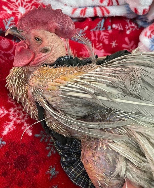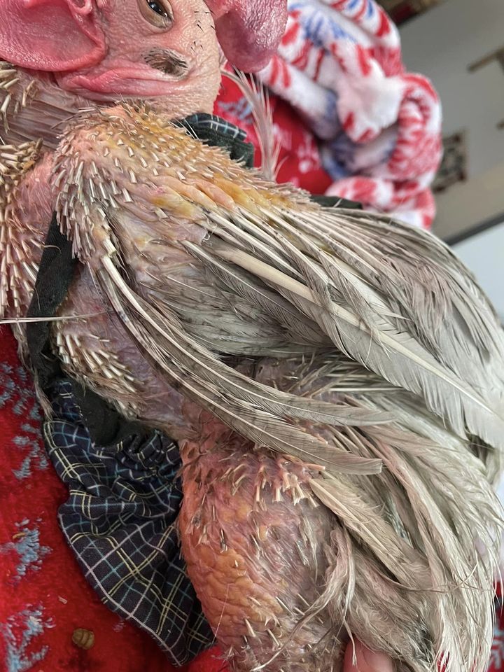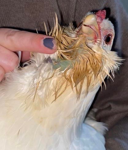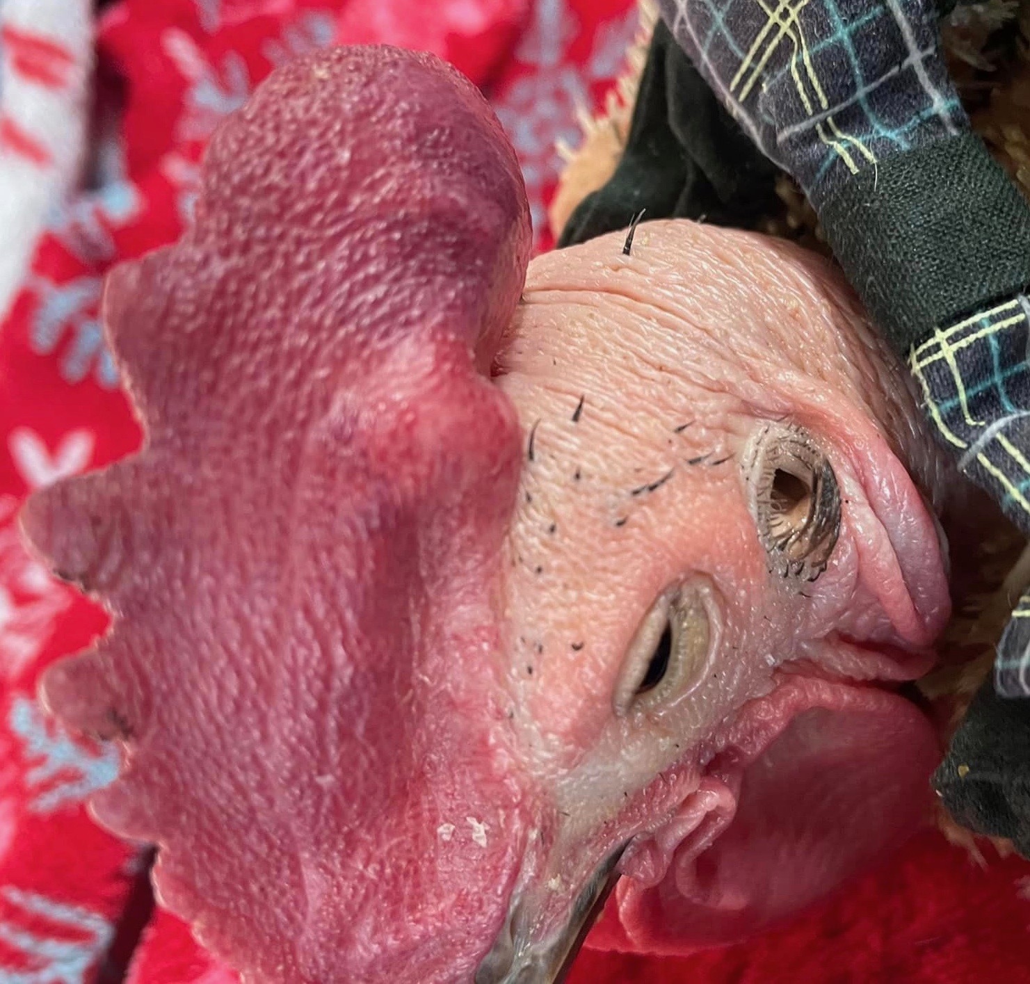 Online Response (name withheld): It’s not fungus. It’s a Staph infection, probably Staphylococcus pseudointermedius, which often causes the hyperkeratosis you’re seeing around the follicles. Get some iodine or Chlorahexidine and wipe his face and neck with it every few days till those keratinized feathers fall out and new ones start to grow. That particular Staph is susceptible to Baytril/Enrofloxacin. It’s pretty obvious when chickens get it because it causes very visible symptoms: powdery skin, crusty areas, hyperkeratosis, skin peeling and feathers falling out.