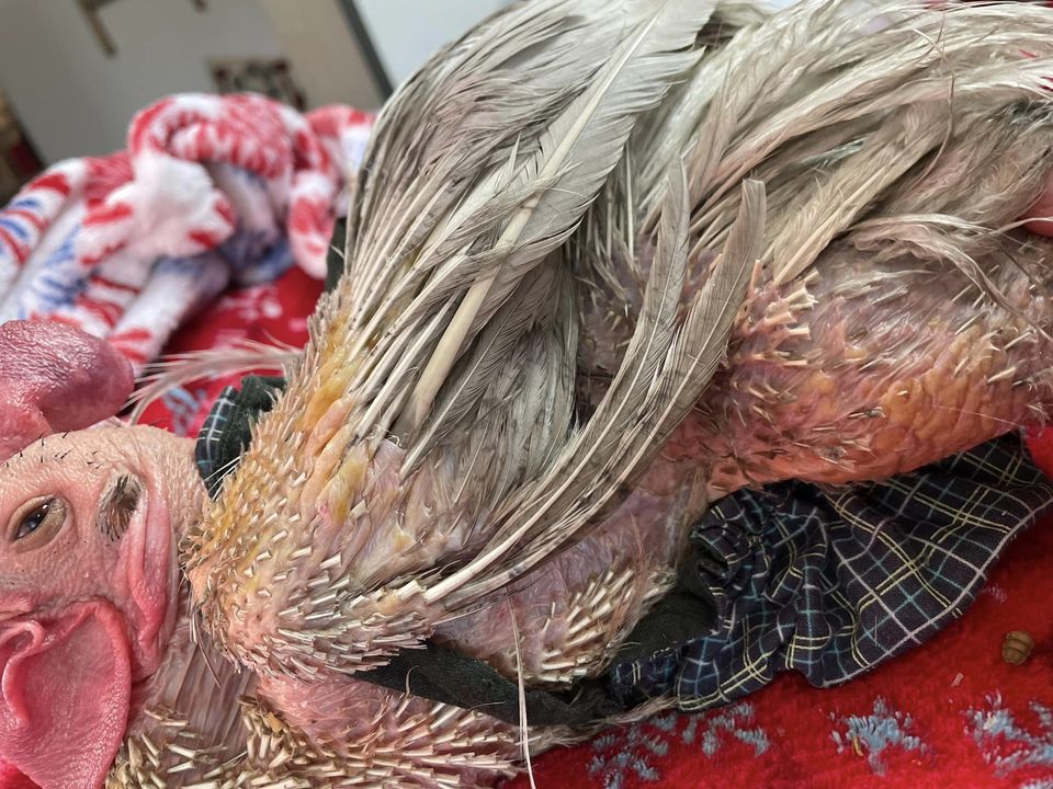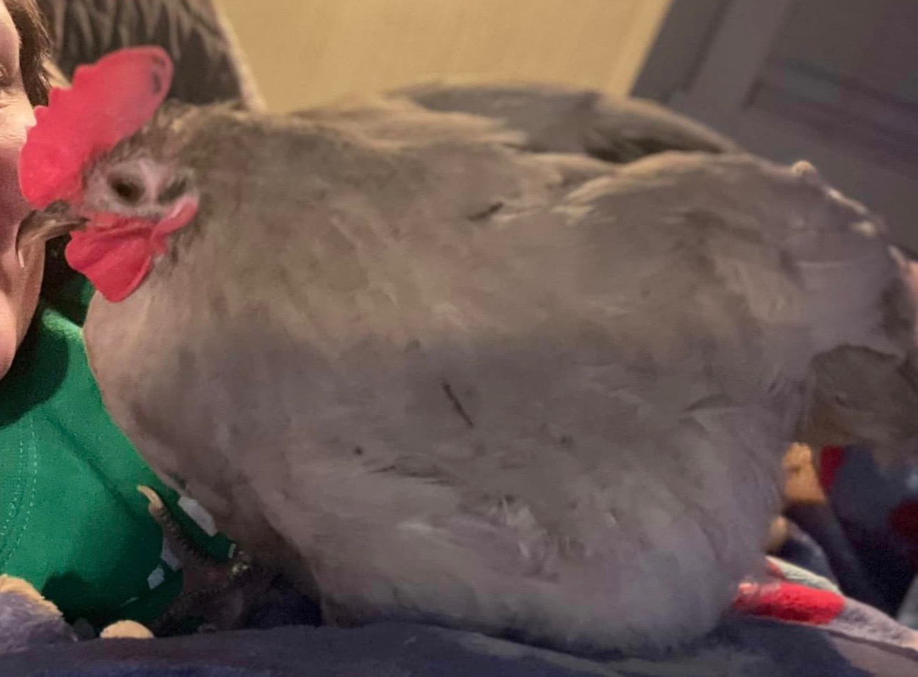 He is a special needs chicken so the added stress is getting to be too much for him. He has a leg that turns inward so he can’t walk well. When he gets stressed his comb turns purple and the open mouth breaths. He has always done this. Now when he gets really stressed, due to the long treatments, his bad leg quits working and he can’t stand at all. He is still eating and drinking well. I also included a photo of when he was healthy for reference.