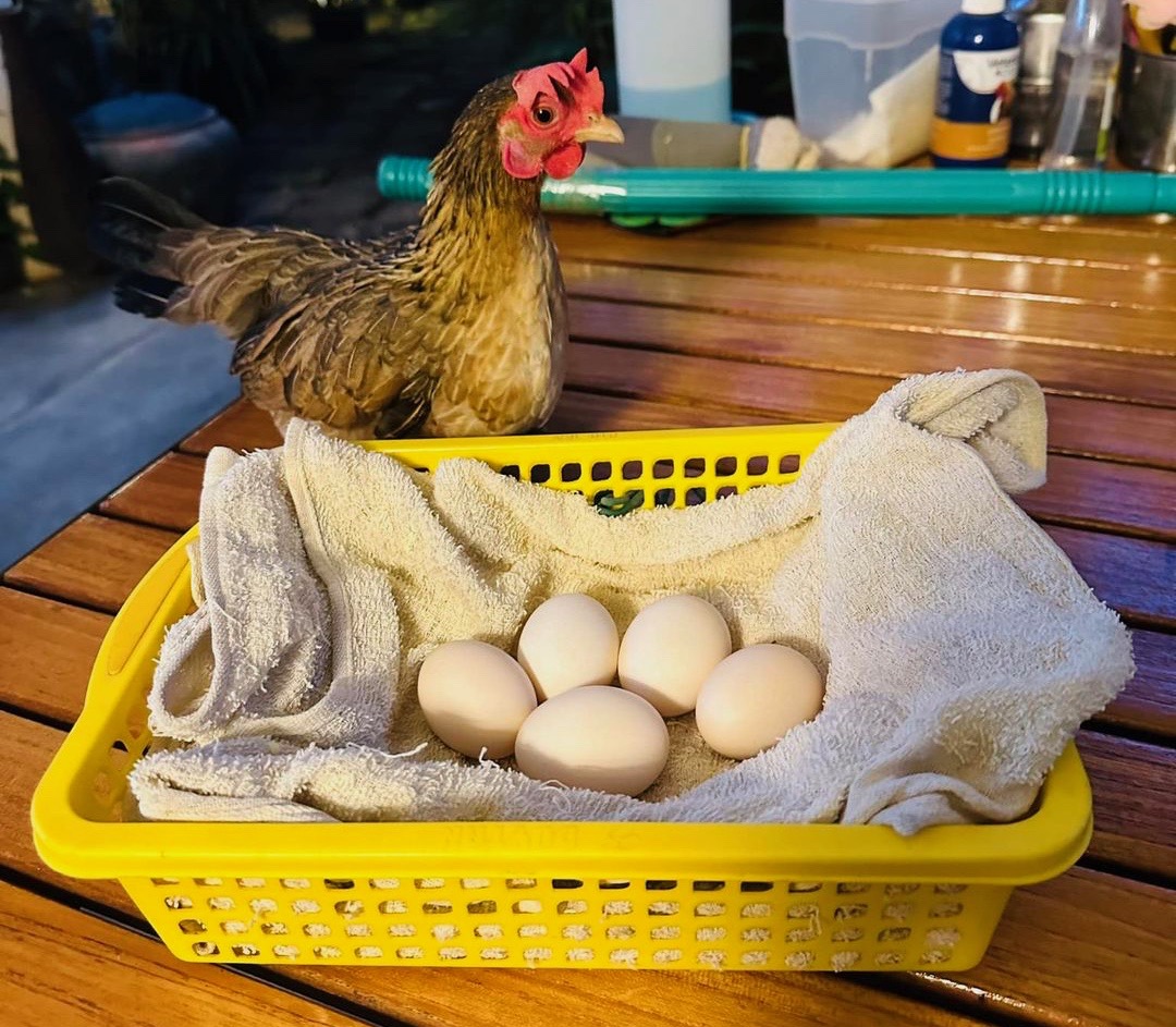 Angel is a house chicken because his mother died a few days after being attacked by a dog. She didn’t have any puncture wounds and seemed fine but shaken up a bit. The strange thing about her death, which was sudden, is she started eating the only egg we put into her clutch from another hen.