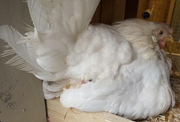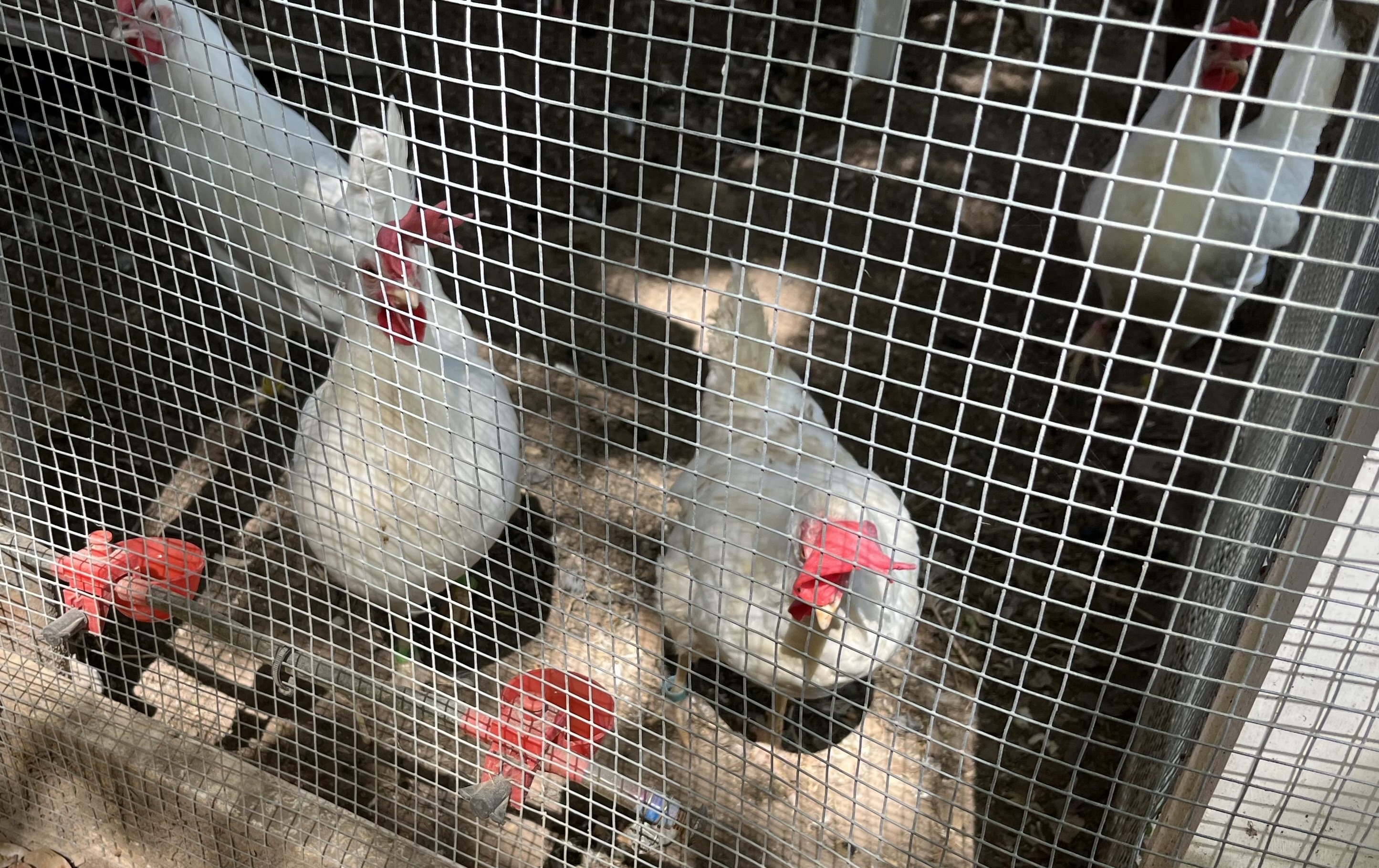 I have six hens: three white Leghorns and three Rhode Island Reds.