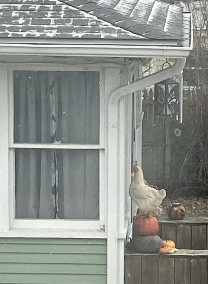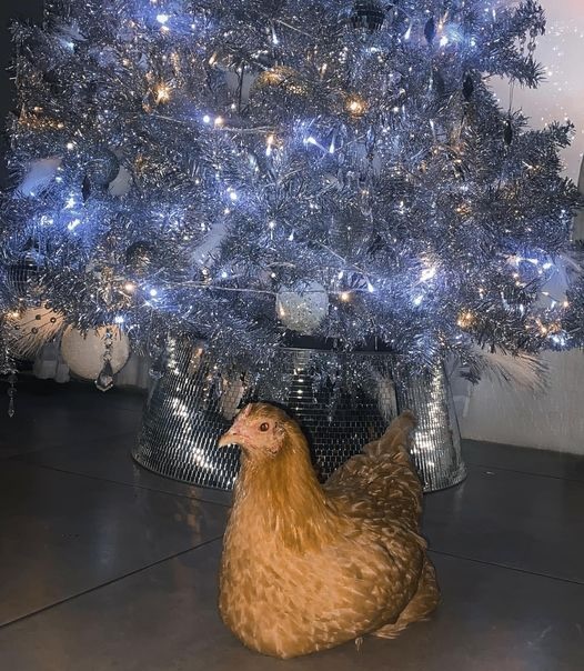 My daughter’s chicken got a tad spoiled being inside the house healing from an attack. She now knocks on the door with her beak when the sun starts to go down as if she lives inside. She’s outside all day though we do still have her sleeping inside for now. But she’s too used to it. She ran in and made herself comfortable in front of the Christmas tree. – Michelle King