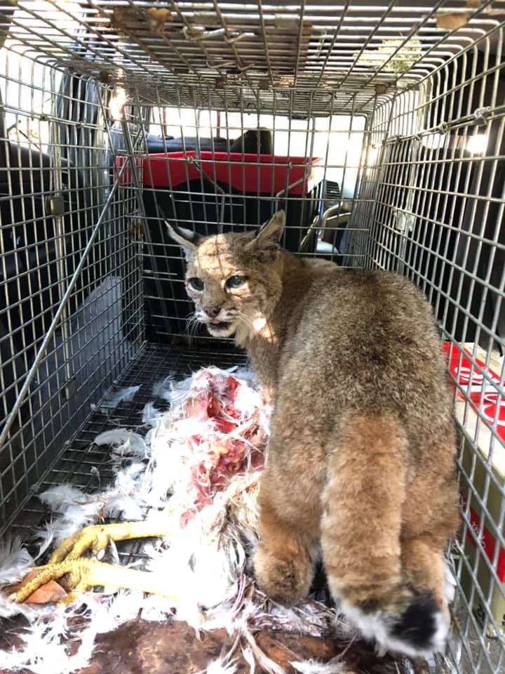 This bobcat killed a chicken. Instead of killing it the owners live trapped and relocated it deliberately leaving the chicken for the cat to feed on.