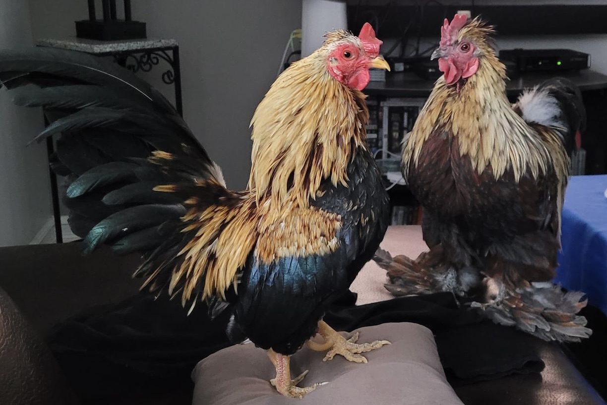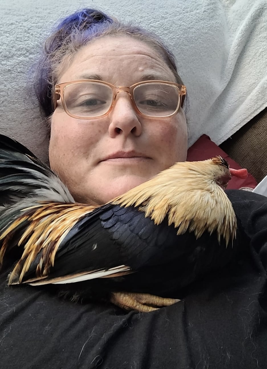 Elsie was a Serama cross. Seramas, bred in Malaysia to be house pets, are the smallest chicken breed on the world. When he was born he was my baby. He was so attached to me he wouldn’t stay with the other chicks. He would stand there and yell till I came back and carried him around with me. Then he chose Brian and he became Brian’s favourite. He always wanted to be with Brian and he would scream bloody murder until he came back. He watched TV with Brian. Perched on his arm or leg. Brian was the chicken caretaker and the King Cock, according to LC and Pippy.