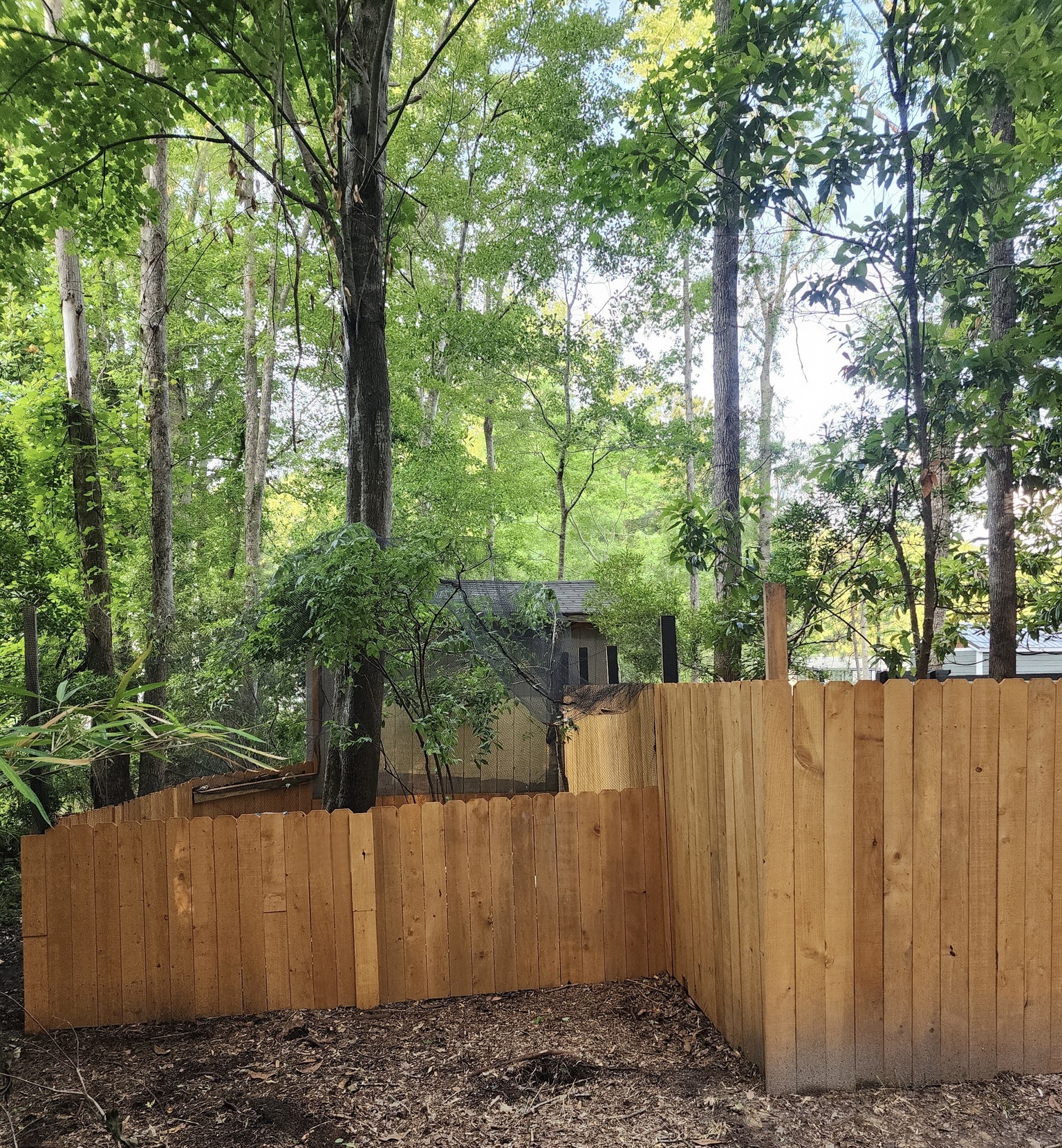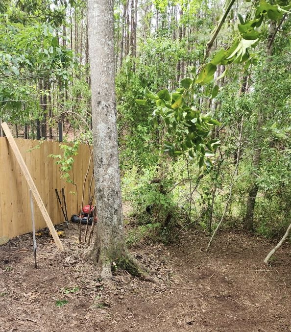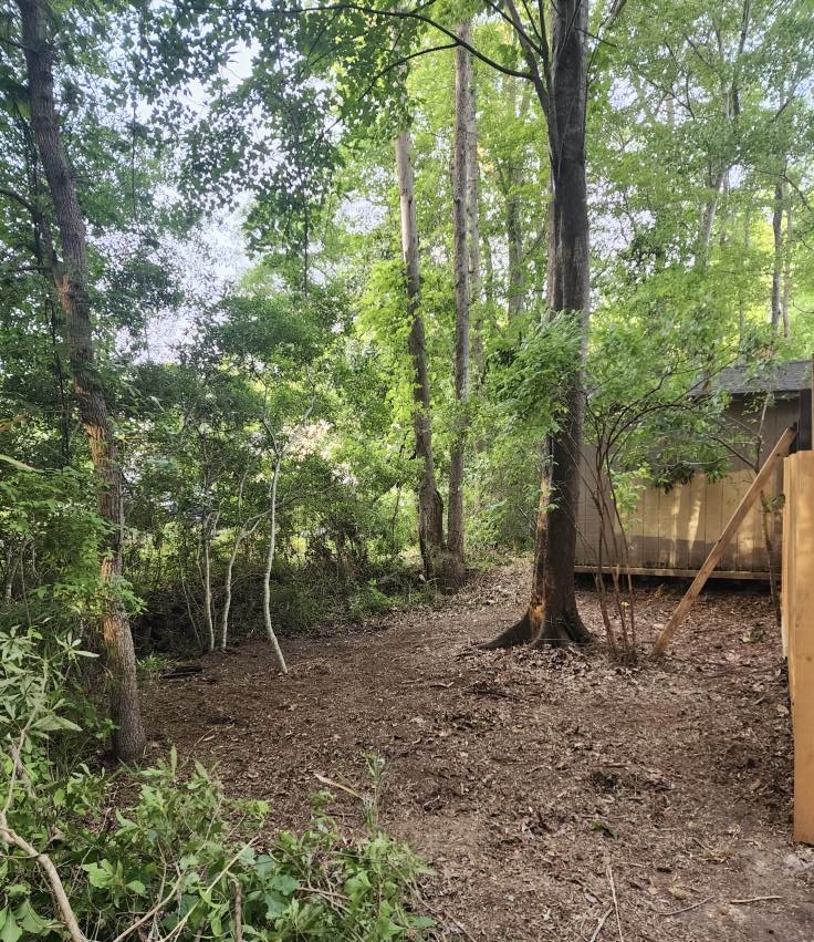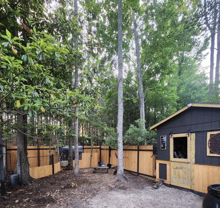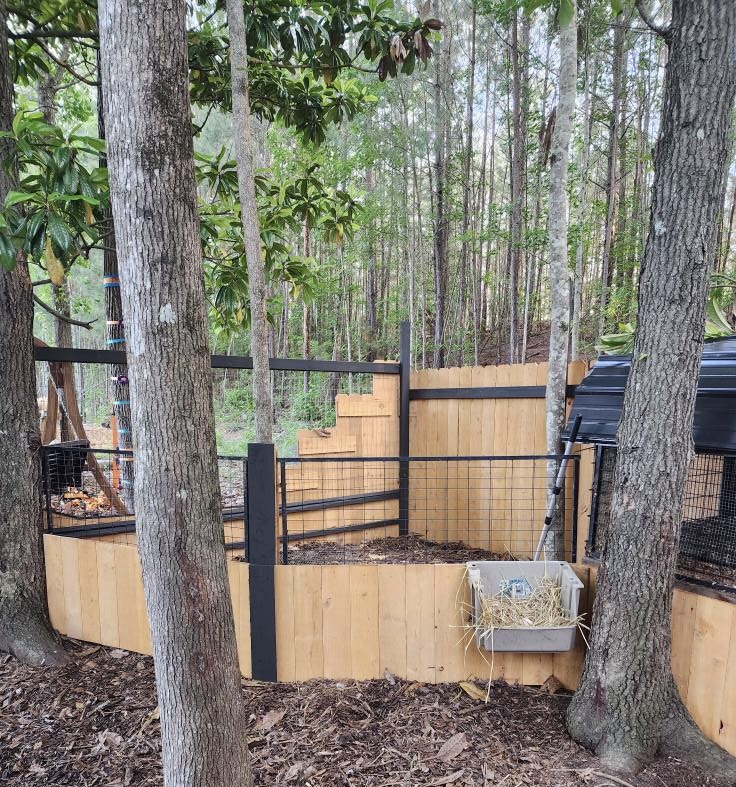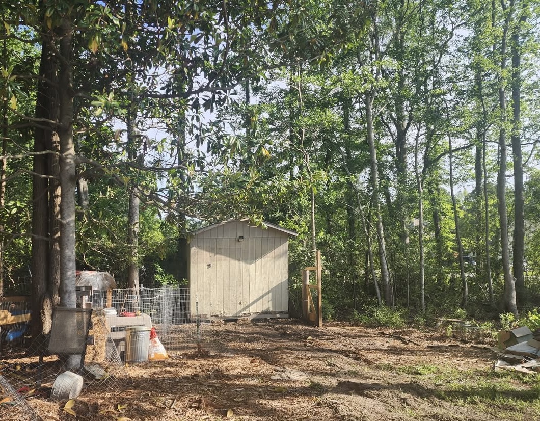 I actually made no plans. I had picked up a ton of salvaged wood that a local fence company had from a tear-out job and we had some leftover treated lumber from another project we had recently worked on. My daddy has a huge garage full of things “we might could use one day” and I sourced some material from there as well. I had an old, broken down shed that we had gotten from a friend of the family when we moved to help with some temporary storage. My daddy brought the tractor over and helped me move it from the driveway to the other side of the yard where I wanted to build the new coop. Other than knowing that I wanted it to begin on one side of the shed and end on the other, I really didn’t have a plan. I started by clearing brush from one side and then started working. I have to say, especially not to have ANY plan for what I was going to do and what I wanted it to end up looking like, it went SO INCREDIBLY SMOOTHLY. I’d get to a stopping point with a certain material, step back and think, “Okay, what can I use next that makes the most sense or how can I make this transition look like it’s happening on purpose?” It just really all went together so well. I’ve never really had a project work out like that. Even when I’d go to level something, which isn’t super easy on your own, especially working with 16′ material. I’d put the level on there and it would just be perfect – I knew I had a heavenly helper.