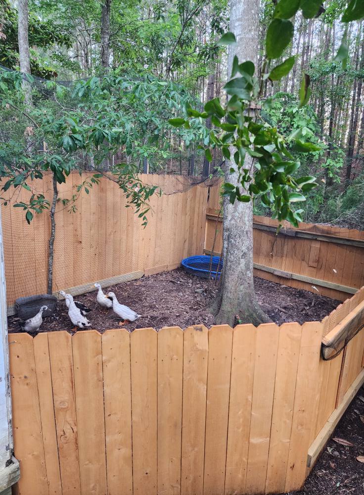 - “Drake Den” which is a separate enclosure I added on for my bachelor ducks, which is 12′ x 24′ and features a duck house and a pool for the boys.