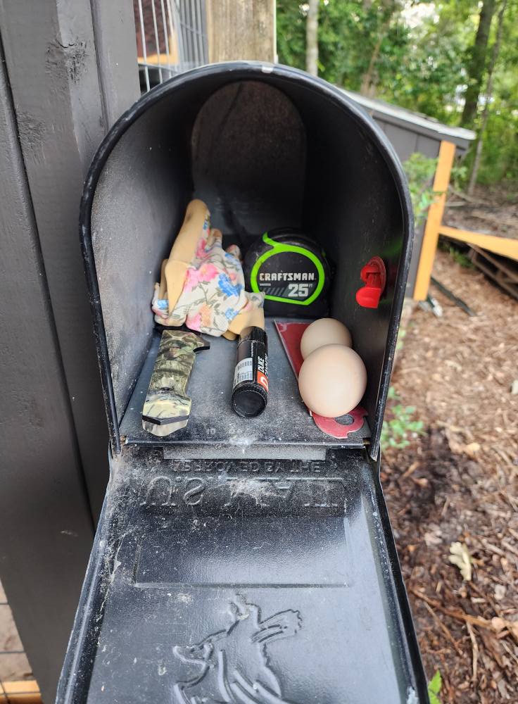 - Mailbox that I keep my gloves, knife and beverage of choice in. It keeps everything dry and keeps the hornets out of my drink