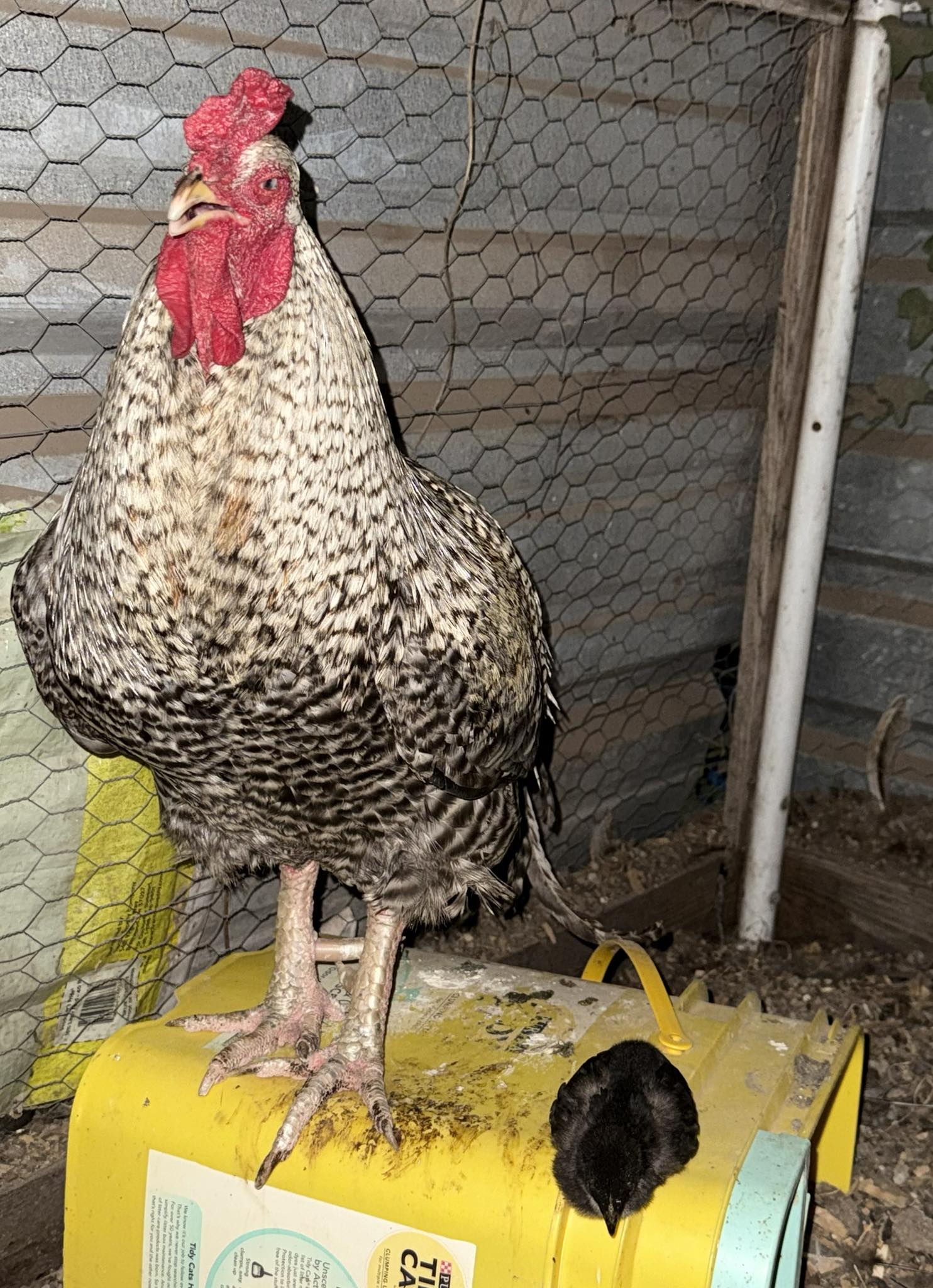 So Sir hangs around and sure, he has some girlfriends, but he is a true gentleman giving them the best scraps, calling when fresh water is filled, and showing the hens where the best nesting spots are. The previously disinterested hens suddenly all go broody and we get the random surprise chicks. He seems to enjoy watching over the growing flock.