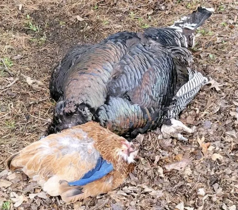 I wanted to share a bittersweet moment. My pet tom turkey died in the yard this evening. He and my older Salmon Faverolle, Olivia, had been raised together and were basically best bird friends. She loved to sleep under his butt any chance she could get and they would always hang out together all day, every day. I showed her his body earlier and when I came out to move him I found her lying right up against him. I let her have her time with him and only moved him once she got up and went to bed.