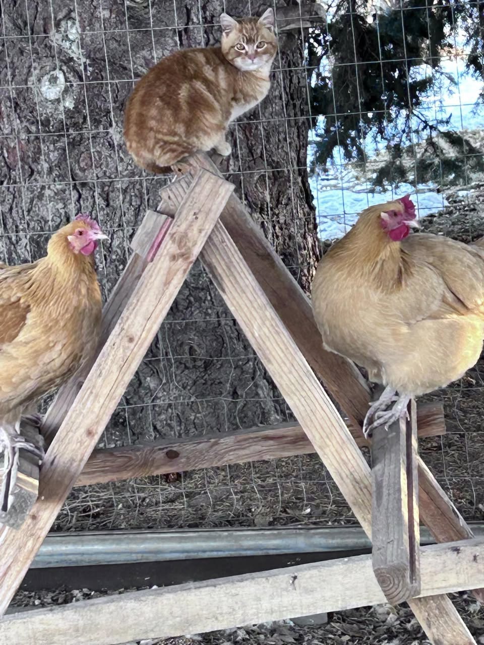 This is our chicken kitten, Teddi. Our chickens adopted her about two months ago. She was orphaned, bedraggled and starving. She had been eating chicken scratch which was causing her horrible stomach problems as you can imagine! We cleaned her up and began feeding her when we fed the chickens. In the meantime she figured out the auto door schedule for the run and the coop door inside the run. She’s been roosting with them at night ever since. Our rooster is especially protective of her. Today I went to feed them before bedtime and here she is, roosting outside with them. Teddi, the chicken kitten. – Annie Sutorius Sweeney