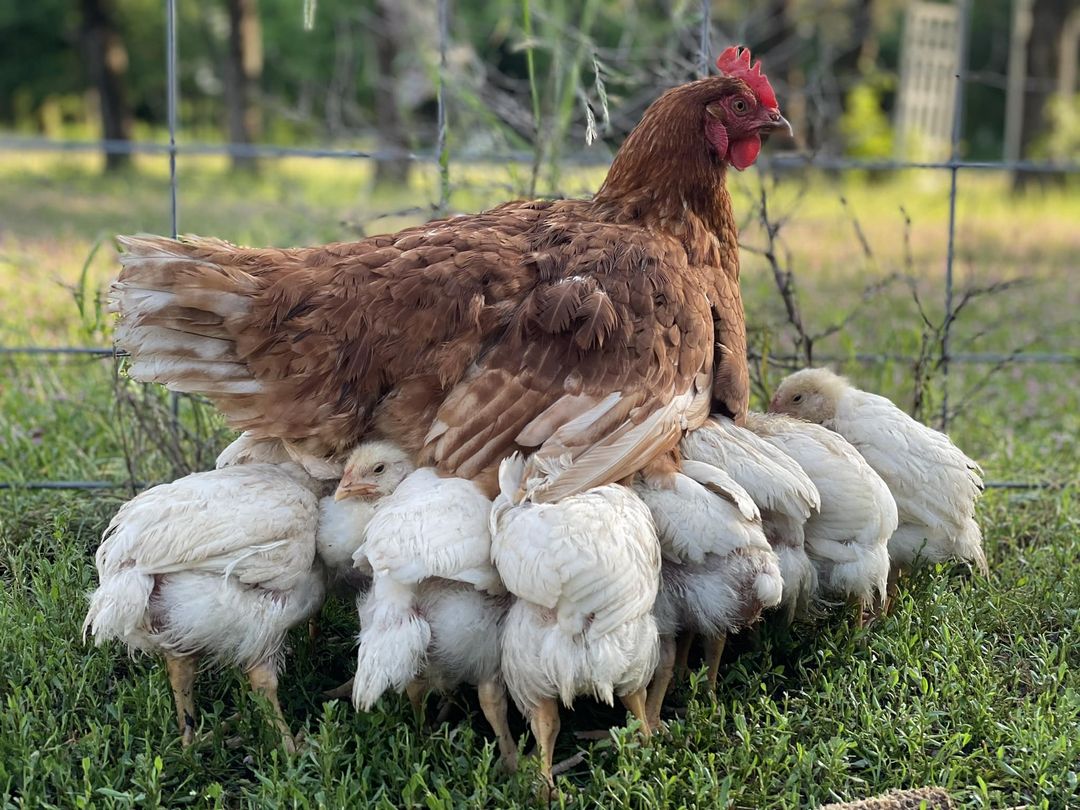 A month ago my new hen took in a bunch of my Cornish cross broiler chicks as her babies. They’ve now outgrown her wings, but most of them still try to tuck themselves under her whenever possible. She still looks out for all 35+ of them and they are never far from one another. They even pack themselves together on the coop floor every night.