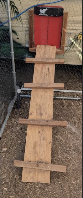 - We installed a Run Chicken automatic chicken door where the camper’s mini-fridge used to be, along with an exterior ramp to the run.