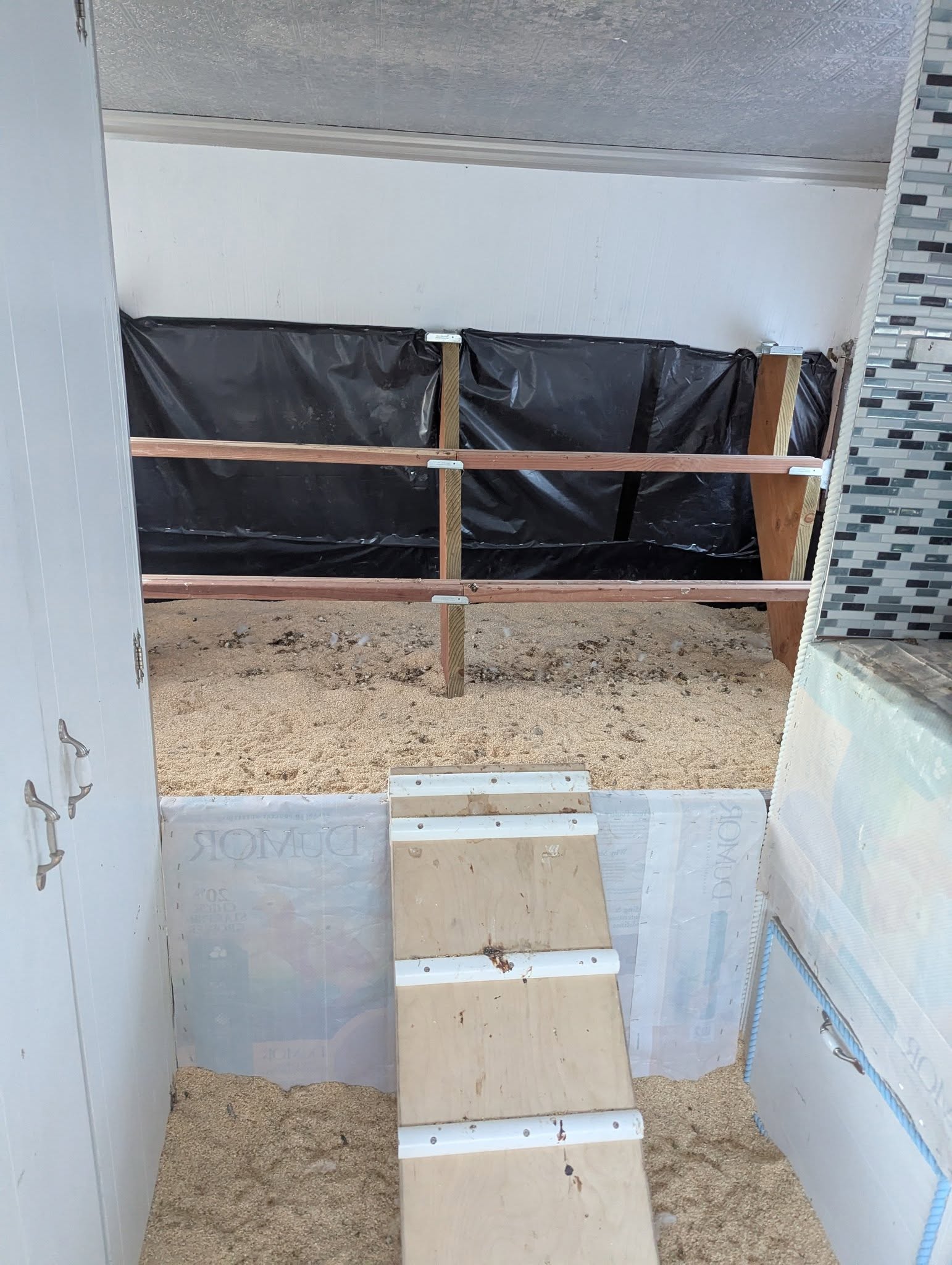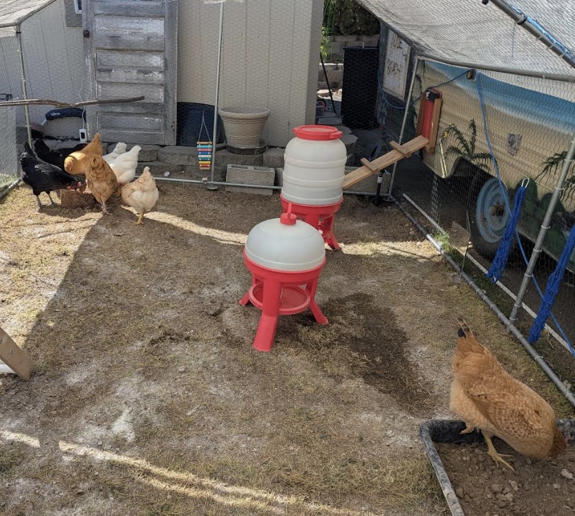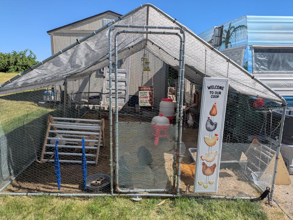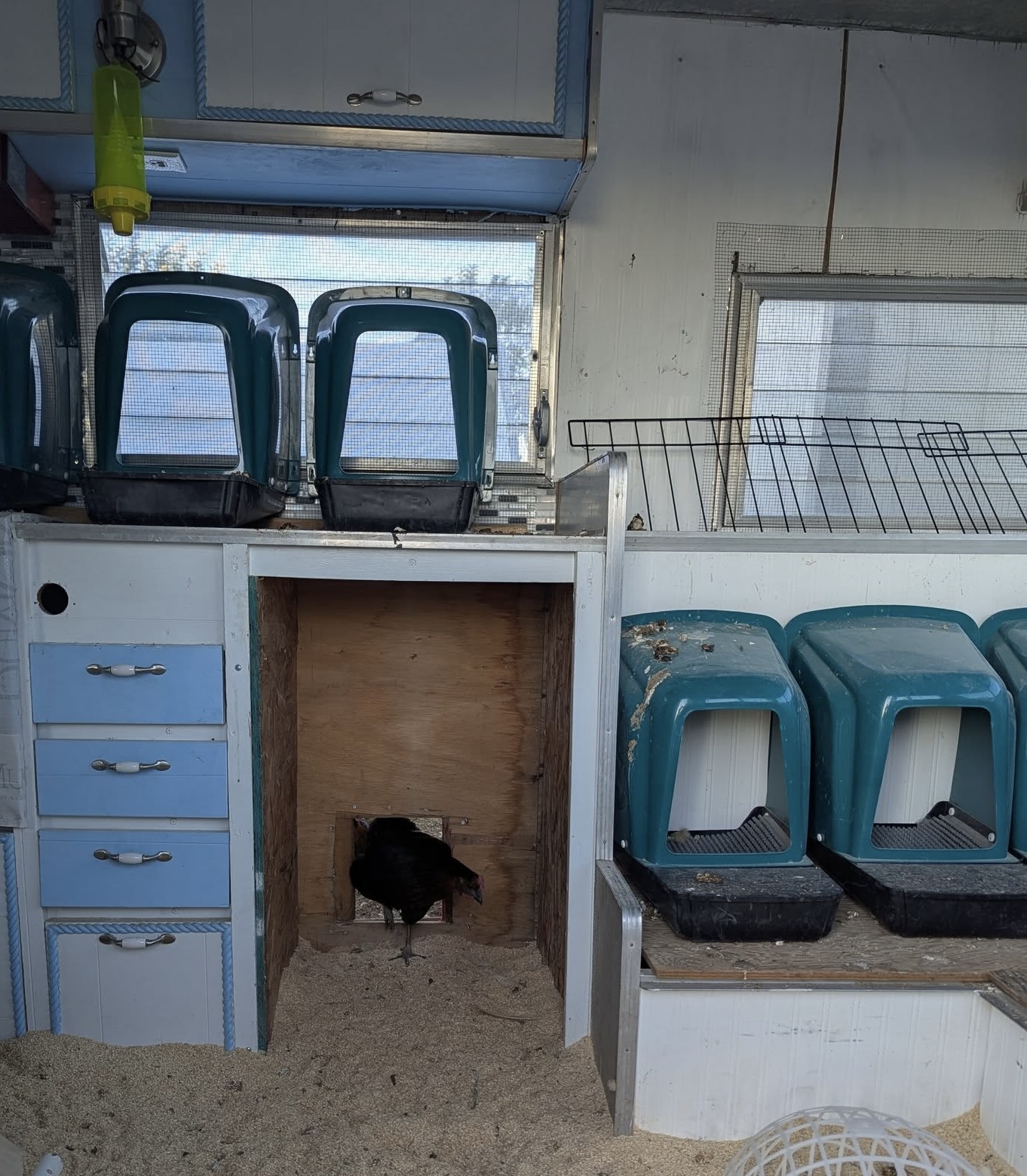 - Overhead and closet storage areas now hold extra supplies like chicken toys, food, and bedding.