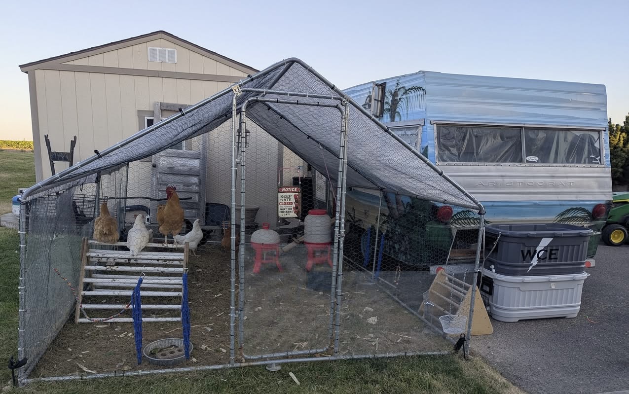 We got our first chickens in early March 2025. While this is our first time raising our own flock, both of our grandparents had large farms with chickens, so we’ve been around them before. We also did a lot of research beforehand to make sure we had the proper setup for our chicks. We currently have seven hens and one rooster: Calico Princess, Buff Orpington, Black Sex Link, and White Leghorn.