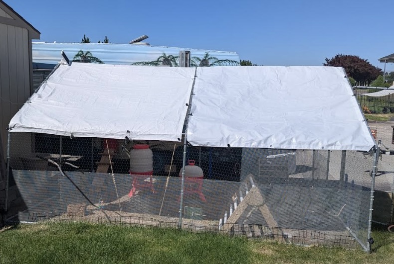Coop: 19’ x 8’ x 7’ Run: 10’ x 13’ x 6.5’. We found the run on Facebook Marketplace and gave it new life with fresh siding and tarps.