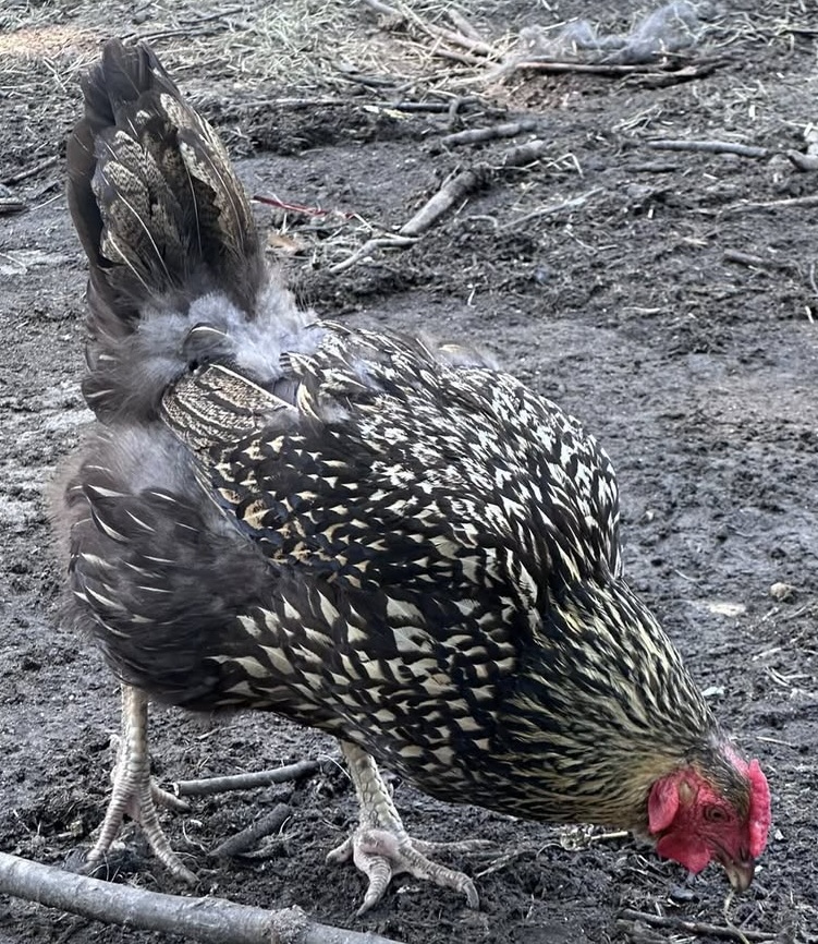 Update: I have talked with the owner of the hen. The hen’s buddy that she used to hang out with is now a special need’s chicken and is housed separately. Since she lost her buddy she’s been a little food aggressive over there. I guess she figured over here she didn’t have to share. We now call her Henrietta and she’s spoiled rotten. – Unknown