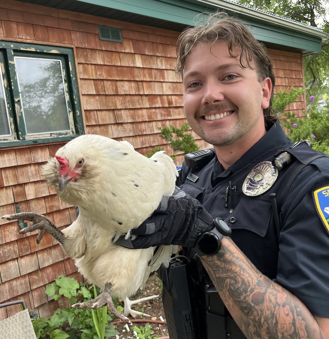 This little comedihen was feeling cooped up at home and went on a freerange adventure this afternoon. No fowl play was committed, and Officer Scanlan did an impeckable job providing a safe eggscort home. – Spearfish Police Department