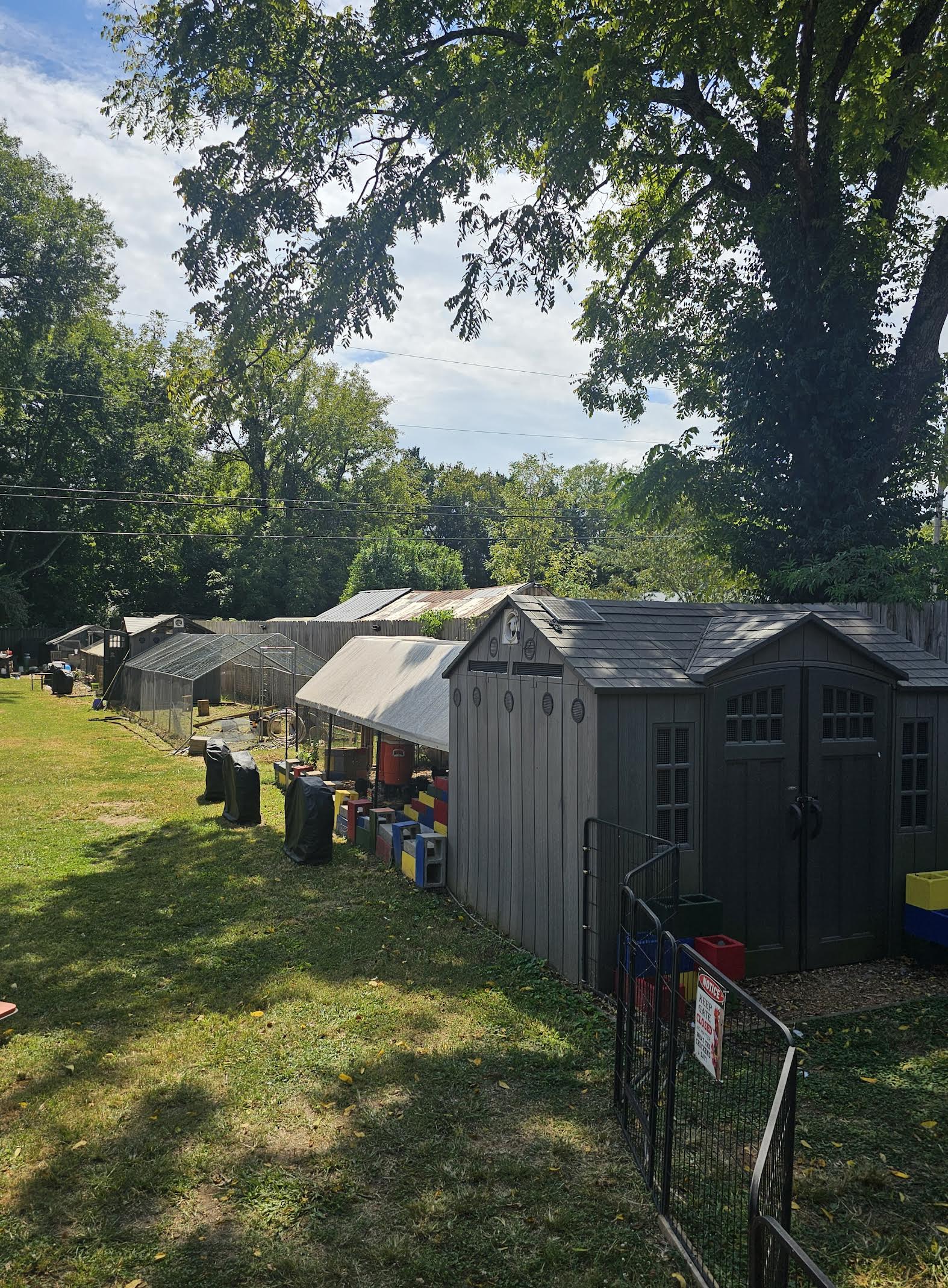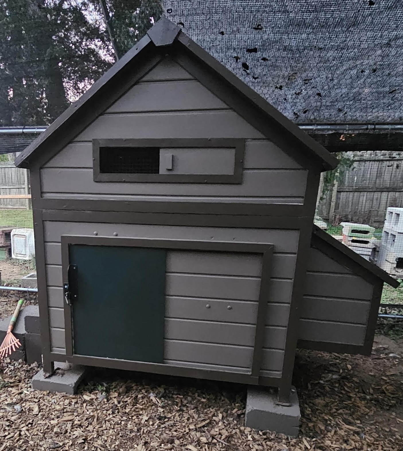 I’m in the process of adding a 10’x32’ run on the other side. There’s a coop door already there for them to choose which side they want that is sectioned into three parts with a shaded section, covered section for protection, and full sun section. It contains roosting bars, a roosting pole, dust bath pool, 4×4 fodder box, and a swing.