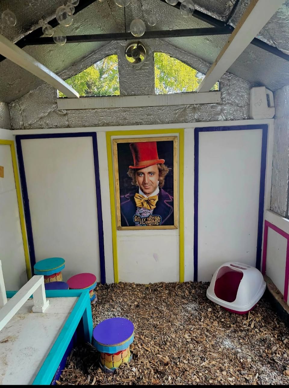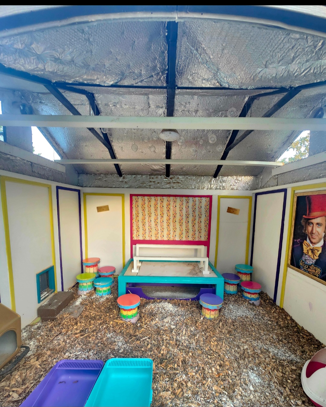 This is my first building project. Growing up, Willie Wonka & The Chocolate Factory wasn’t just my favourite movie it was my mental escape when I was scared, sad or lonely. I spent a lot of time there, so when I decided I was going to breed chocolate birds, I thought it would be cool to turn my safe place into my happy place. Aside from the roof, I completed everything by myself, which took about a year and cost $4000.