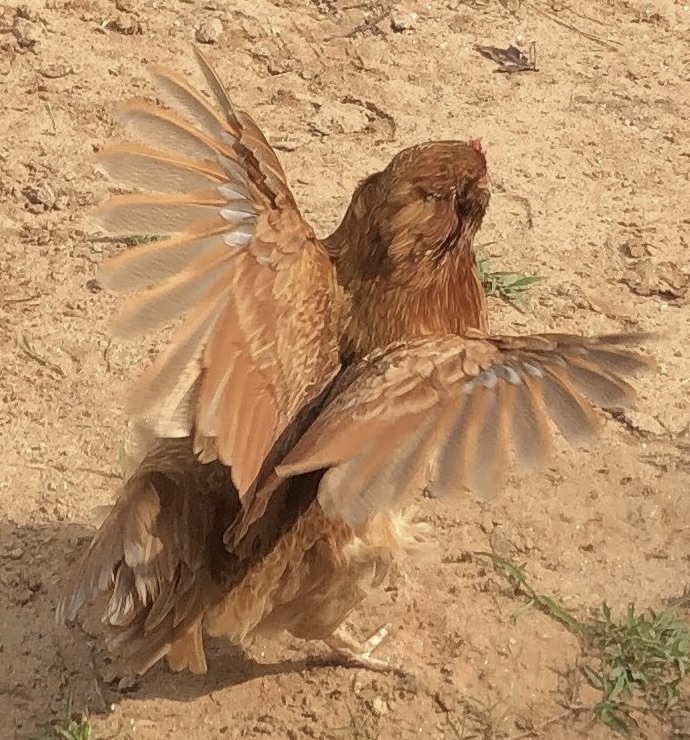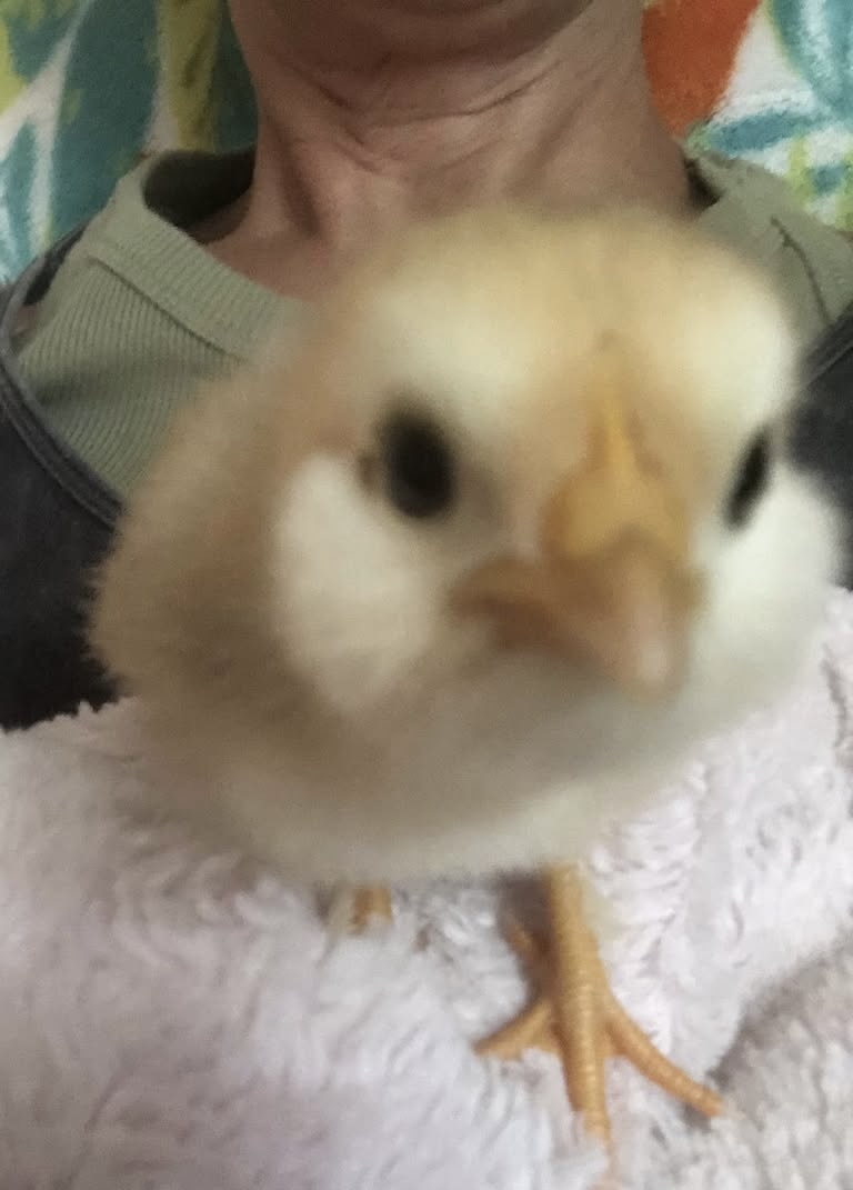 This is Baby. She came from an egg that didn’t hatch. Three eggs did and mama chicken left the nest. I put the egg in the incubator and hoped for the best. Well, the best was Baby! Born four days after her siblings and raised by humans. She thinks she is a pigeon. We refuse to stifle her dreams. Just a happy post of a chicken who is not sick or dead. – Unknown
