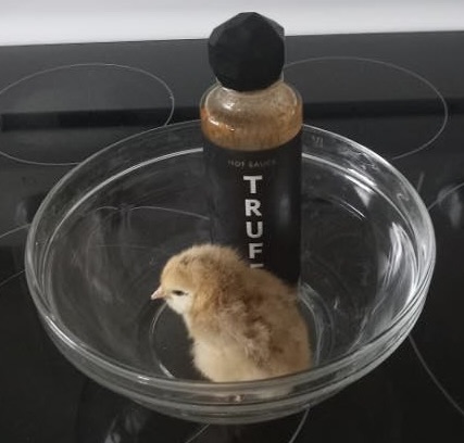 I walked out to feed my chickens and saw this little tiny black baby trying desperately to get under a frizzle bantam rooster. The rooster was trying to get away, like the baby was from a one night stand and he didn’t want to pay child support.