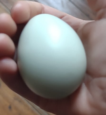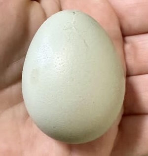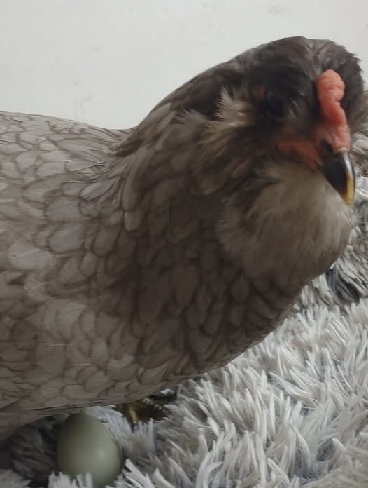 This lady is something else. She kept escaping from our coop and fenced in area and RUNNING back up to the house trying to get in. Pecking at the front door then to the back door and back to the front again. She was acting stressed. I kept putting her back in the coop in a nesting box (I could tell she wanted to lay an egg). After five trips back to the nesting boxes, I finally gave up and let her come inside. I gave her a blanket, and then a towel, for her to make a nest with but that just wasn’t good enough. It wasn’t until I gave her this fluffy cat bed that she decided it was good enough to lay her egg. What a trip. Anyway, thank you for this beautiful teal egg Miss Gwen! These chickens crack me up. Doesn’t get much better than fresh eggs delivered right at your door! – Leanne Brander