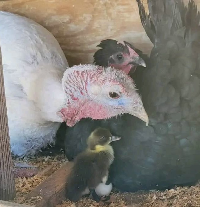 We have an 8-year old turkey who will sit on anything resembling an egg. She hasn’t laid any in a couple of years and she is broody every year. This year she was joined by a broody hen in the same box and the chicken eggs are not fertilized either. We had some fertilized duck eggs and no broody ducks so we figured why not let the turkey and chicken have a clutch of duck eggs. AND THEY HATCHED! This must have been the inspiration for a real life Tur-duc-ken! – Unknown
