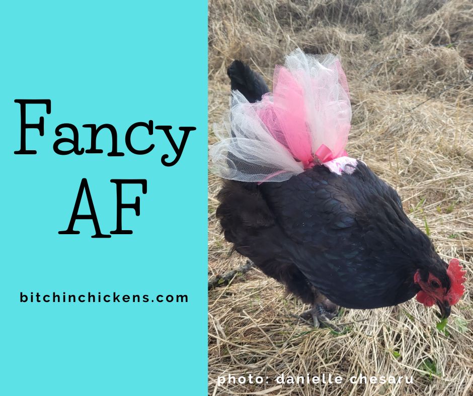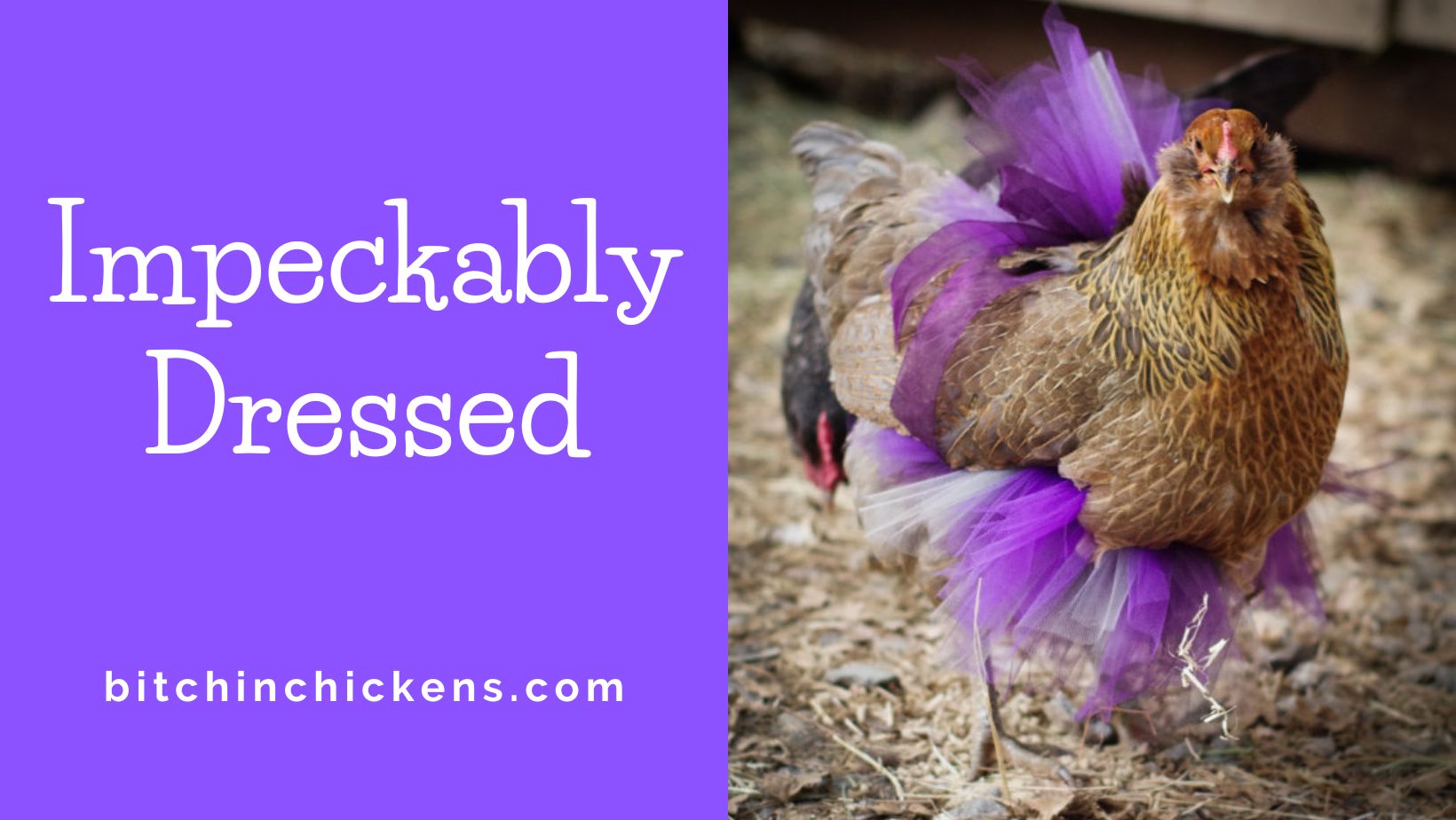 This month’s theme is apparel: chicken keepers wearing chicken prints and flock members donning hats, pants and tutus. Enjoy!