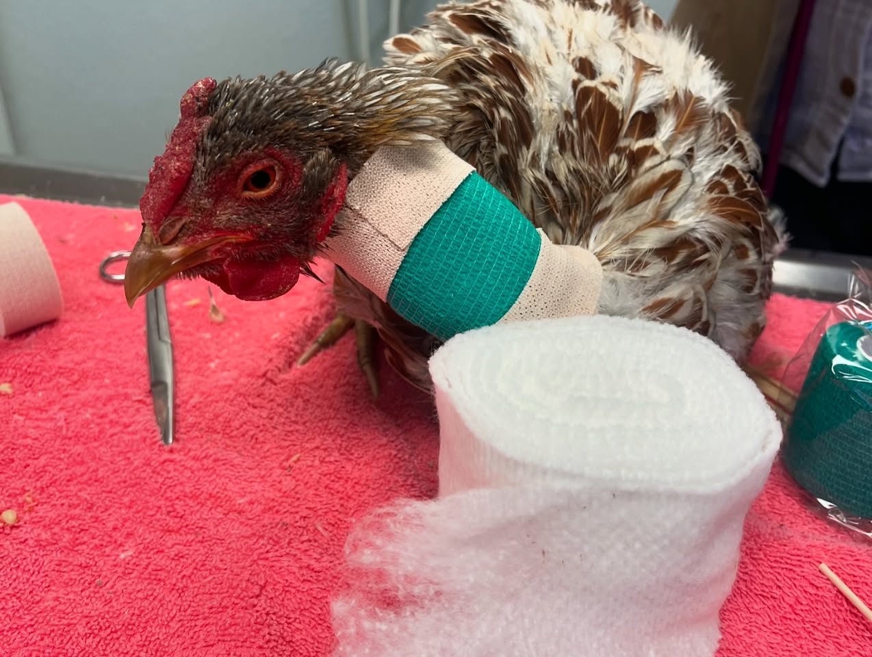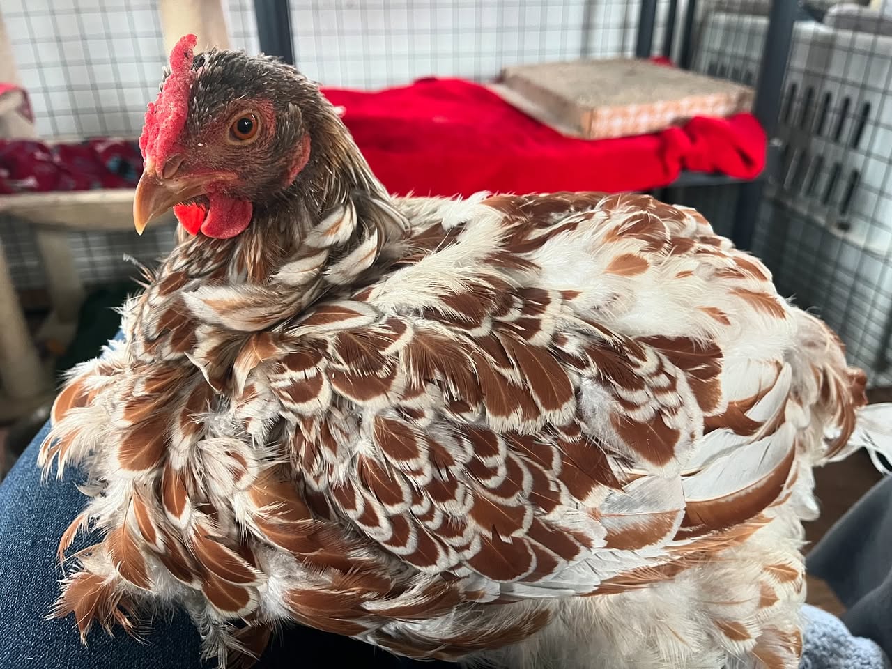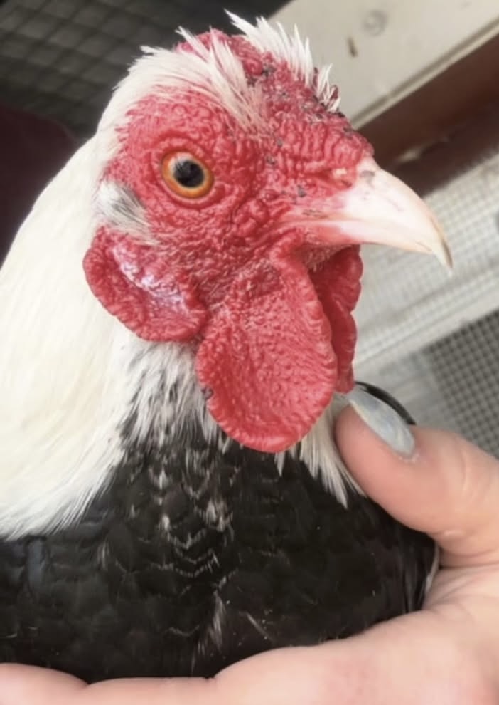 Finally a wonderful human heard about him and brought him inside while she looked for help. Thankfully we were able to take him and she got him directly to our vet. He lost most of his comb but is otherwise now safe and healthy. And he now has a girlfriend!